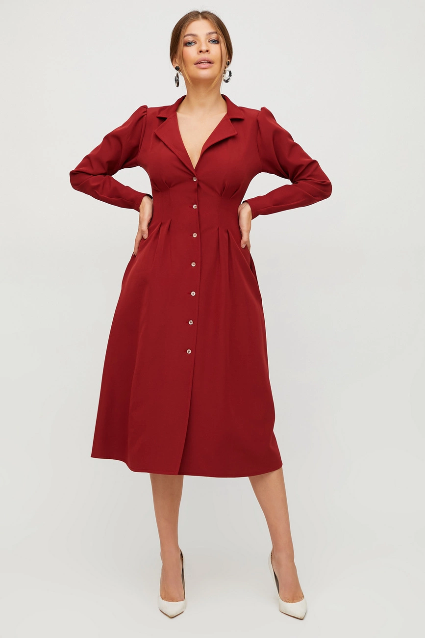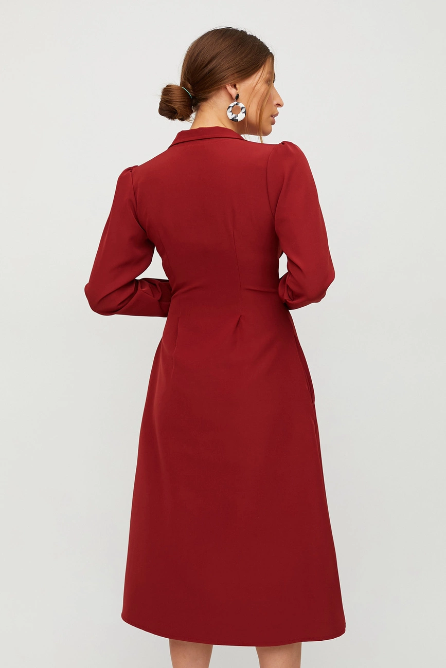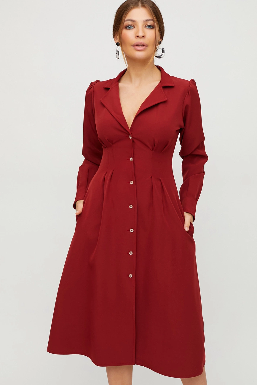 Платье миди длины из плотной слегка тянущейся костюмной ткани, глубокое декольте, отложной воротник, рукав длинный; застежка: пуговицы