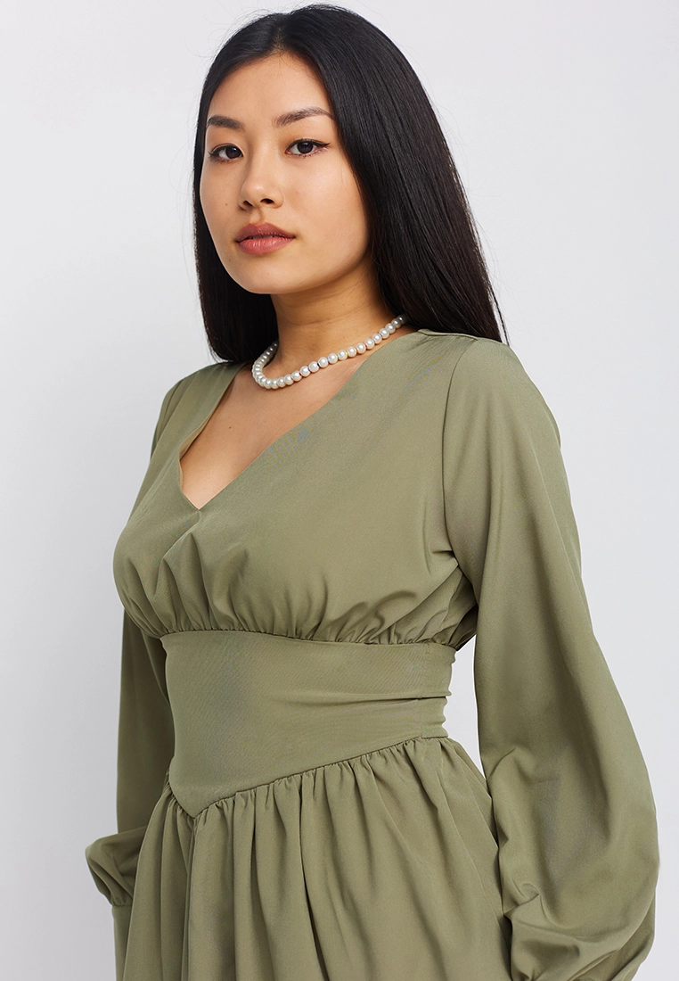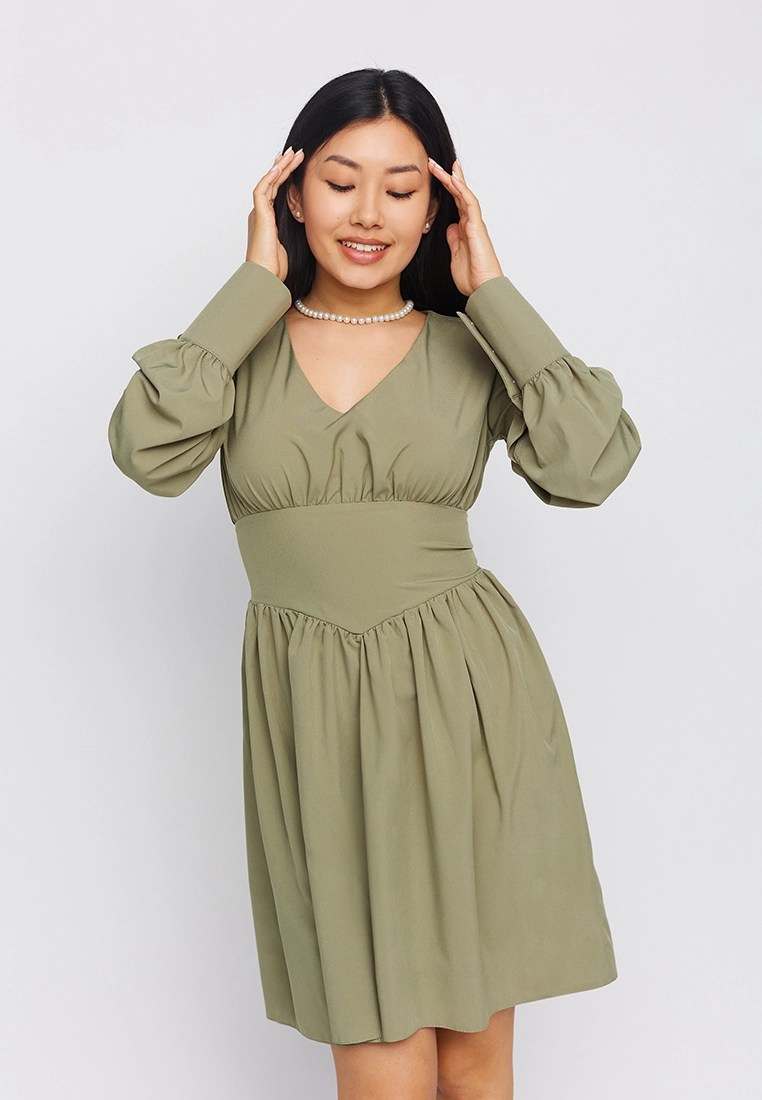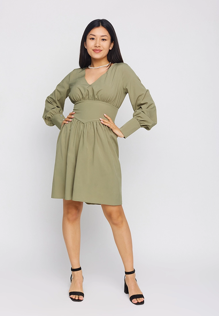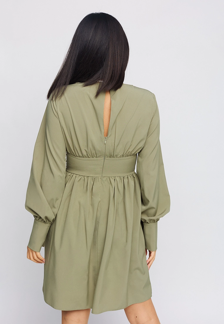 Платье мини длины, длинный рукав с манжетам, широкий пояс, юбка полусолнце, застежка пуговица и молния