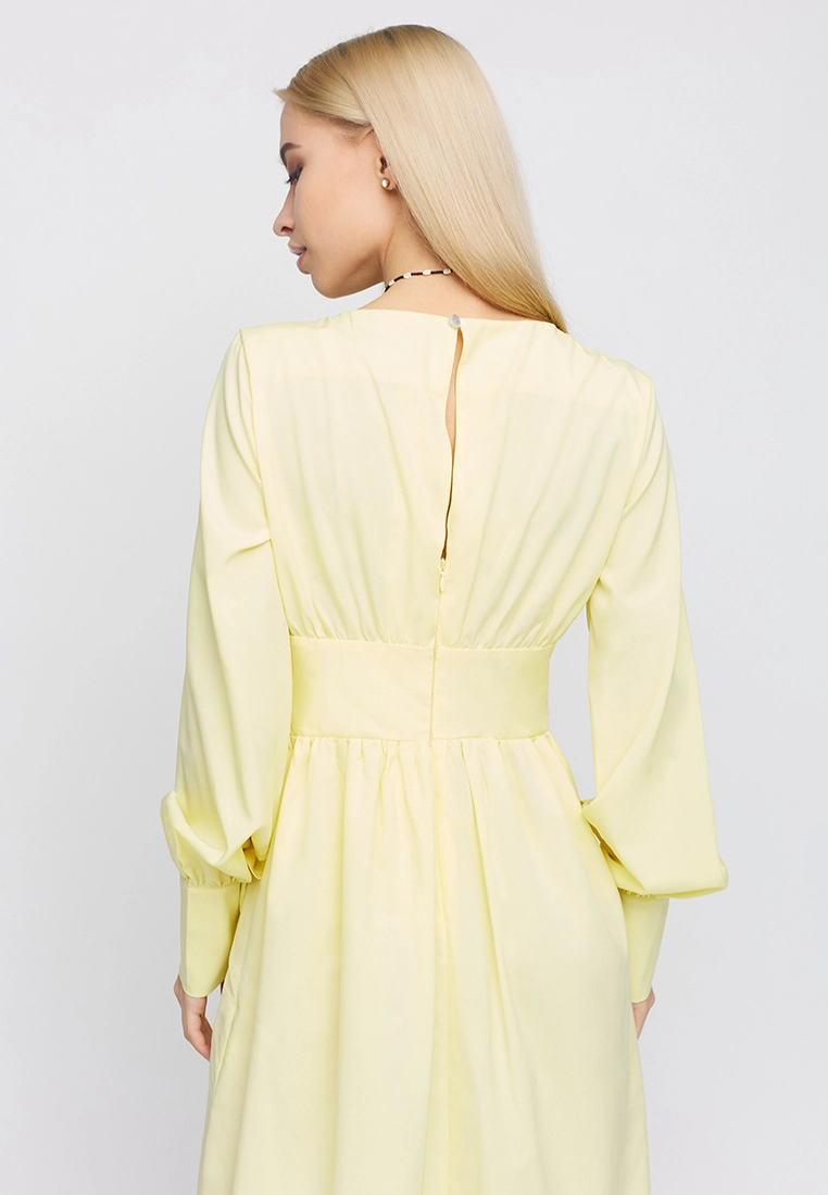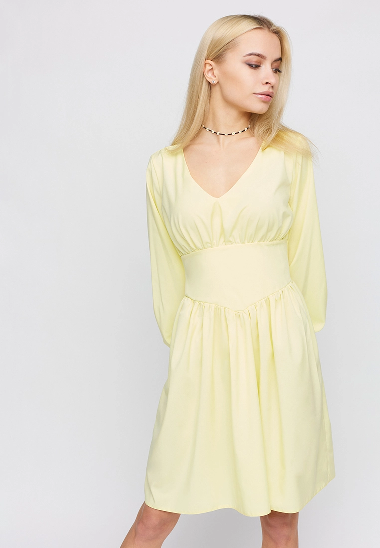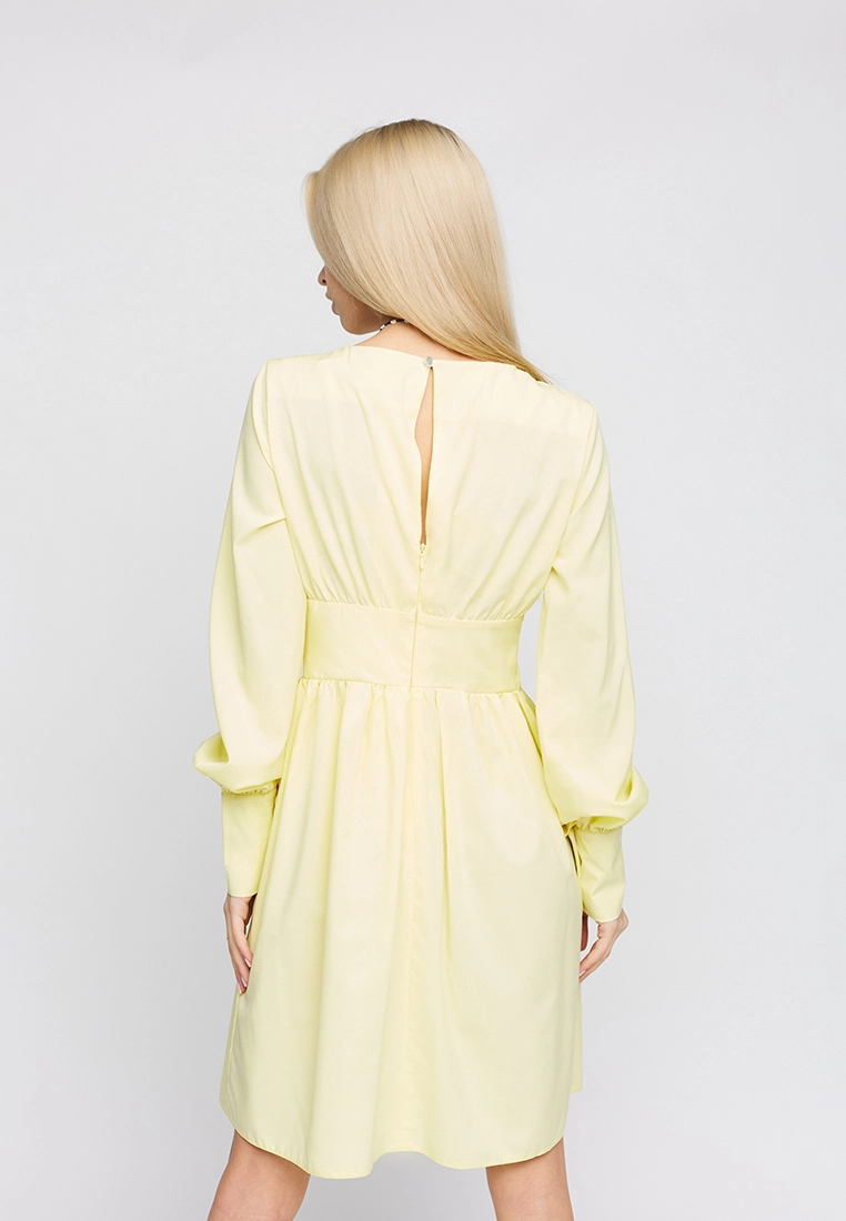 Платье мини длины, длинный рукав с манжетам, широкий пояс, юбка полусолнце, застежка пуговица и молния