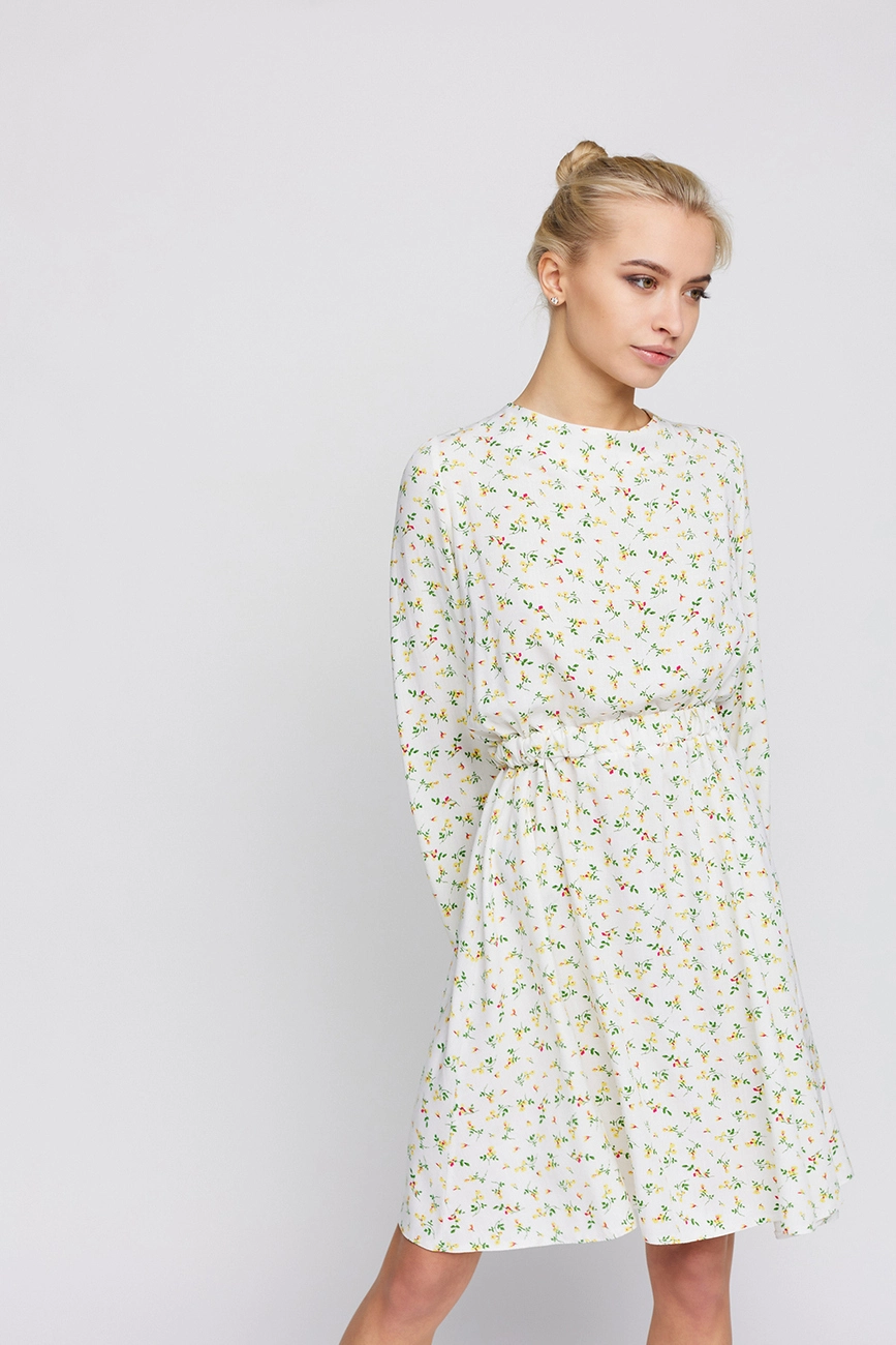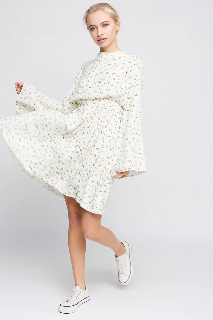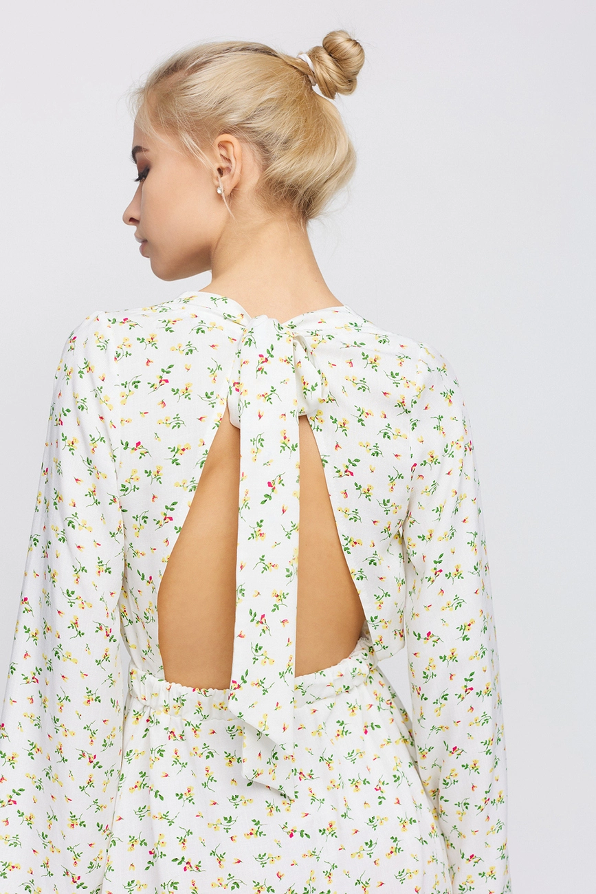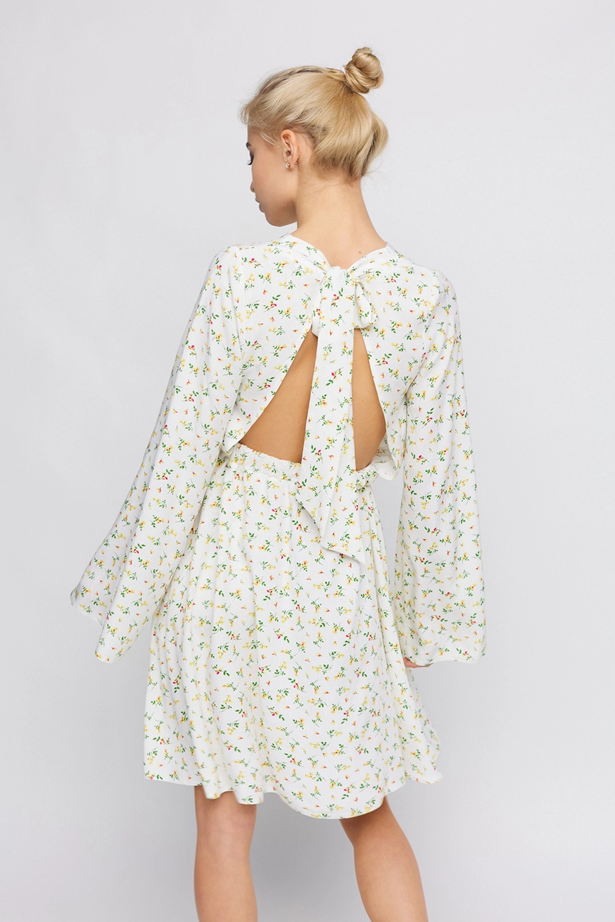 Платье длины мини из легкого штапеля, длинный расклешенный рукав, открытая спина, на талии резинка, на спине длинные завязки