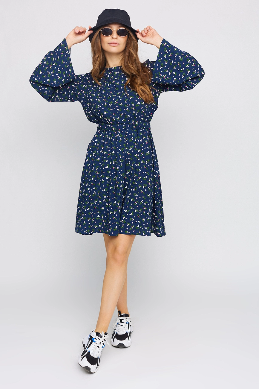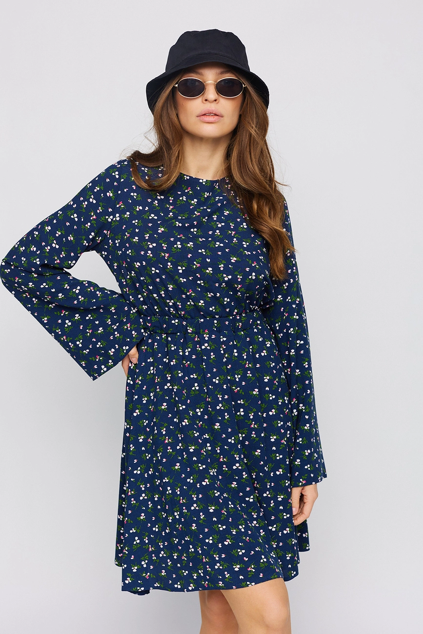 Платье длины мини из легкого штапеля, длинный расклешенный рукав, открытая спина, на талии резинка, на спине длинные завязки