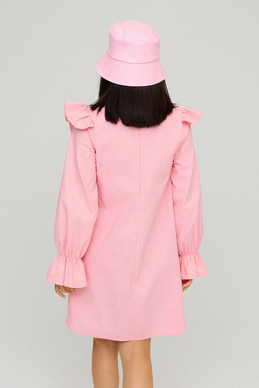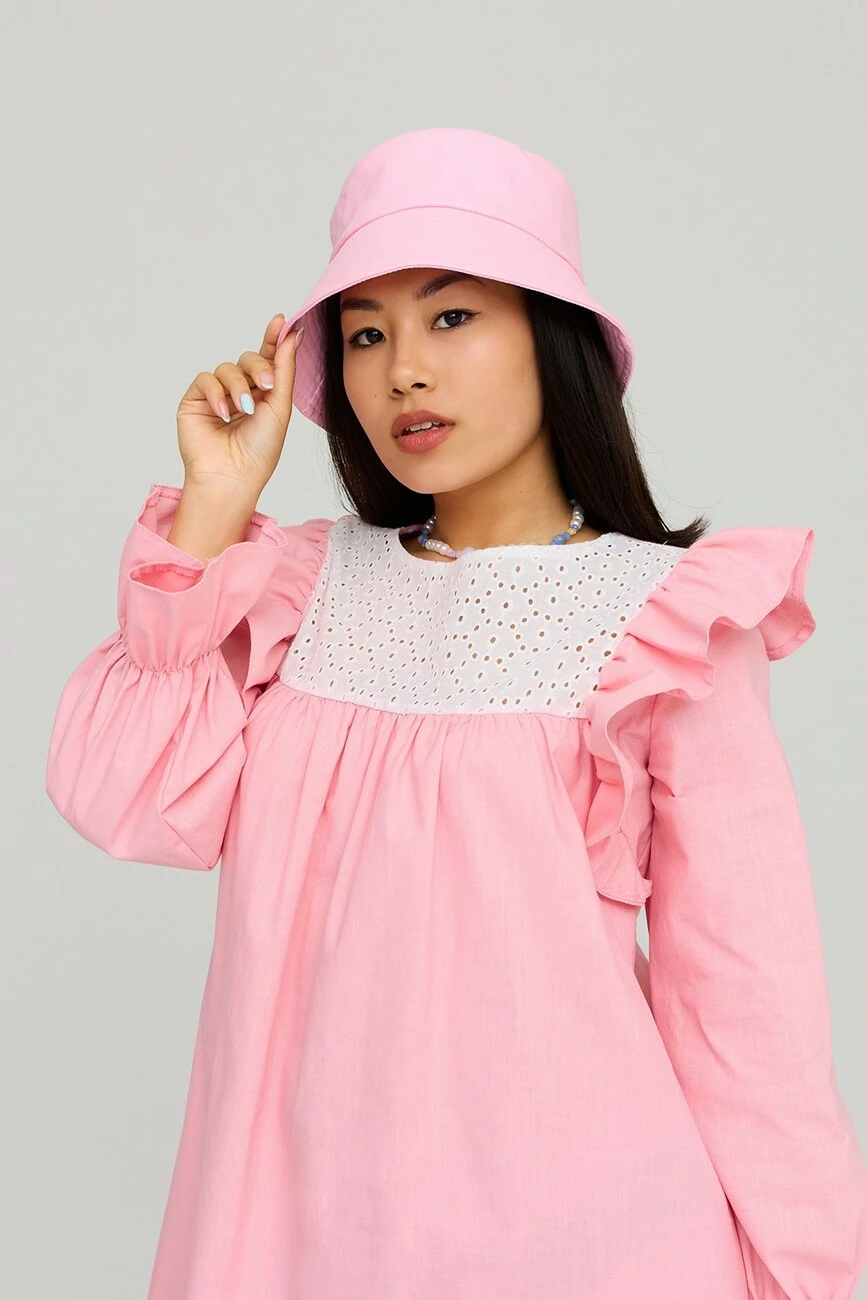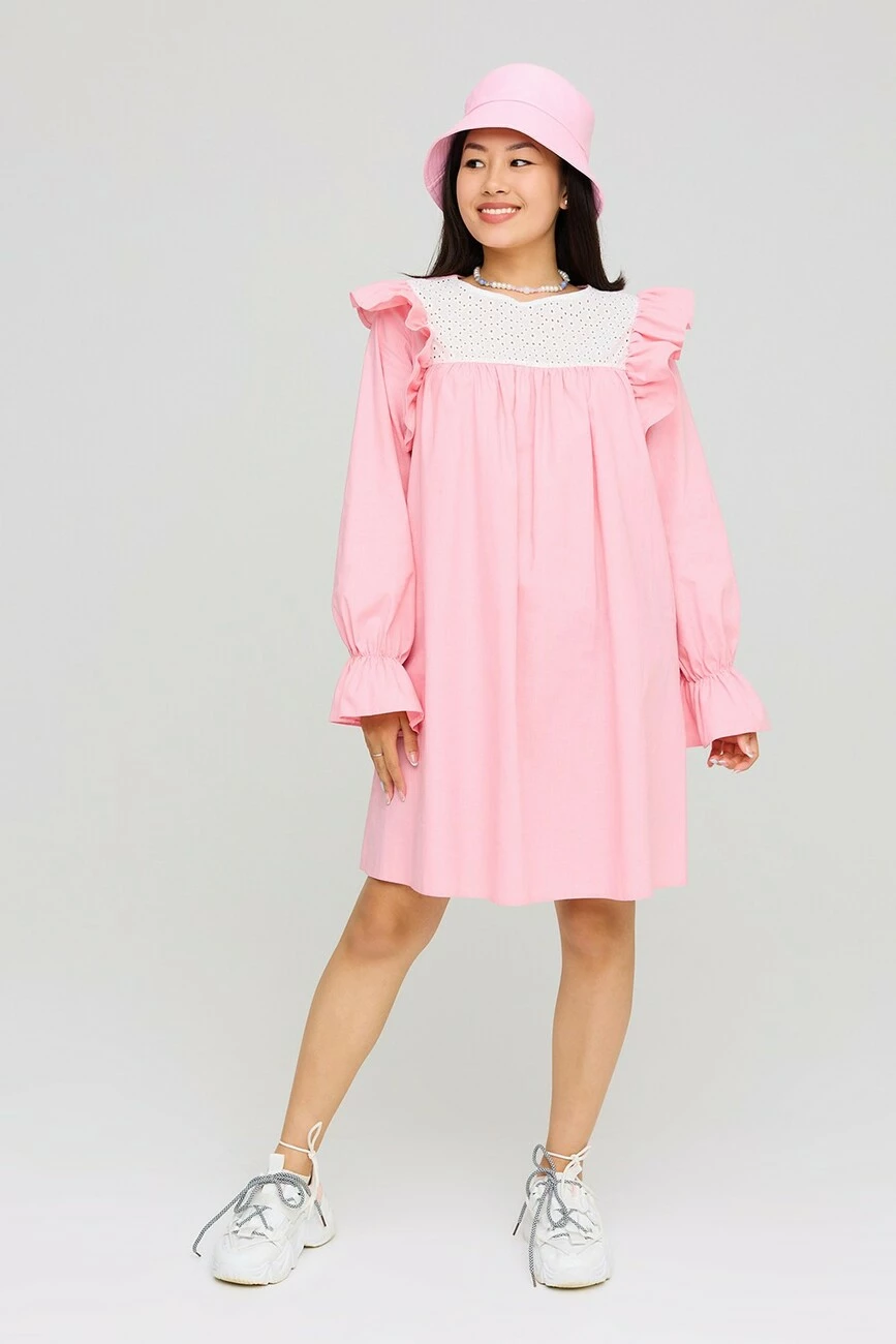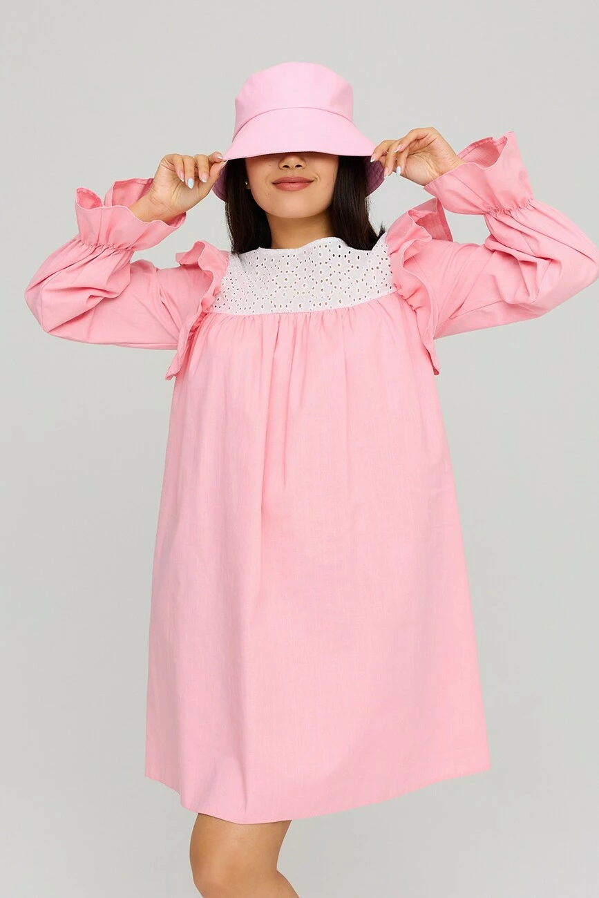 Платье А-силуэта из фактурного льна. Длина мини, длинный рукав собранный на резинку, по груди кокетка из прошвы. По плечу декор в виде небольшого валана