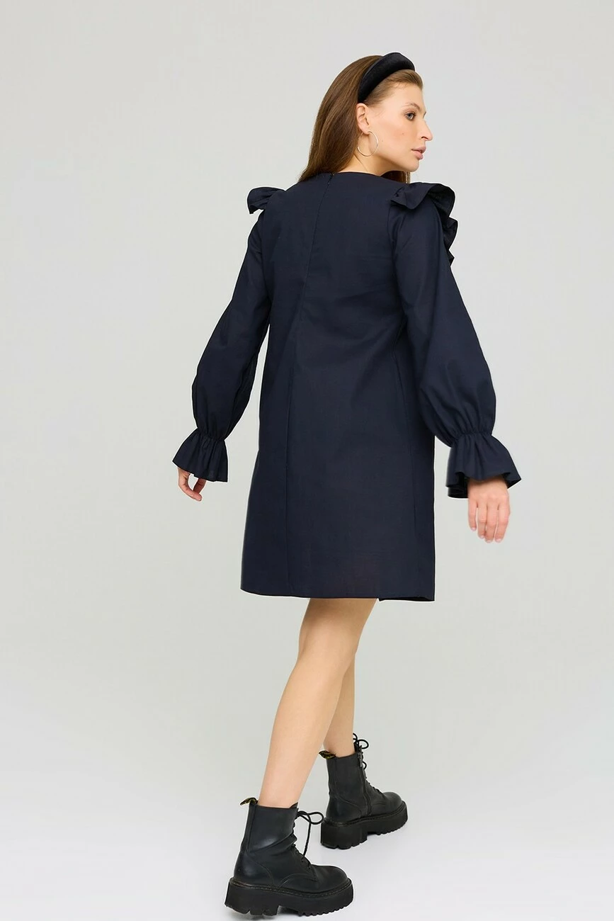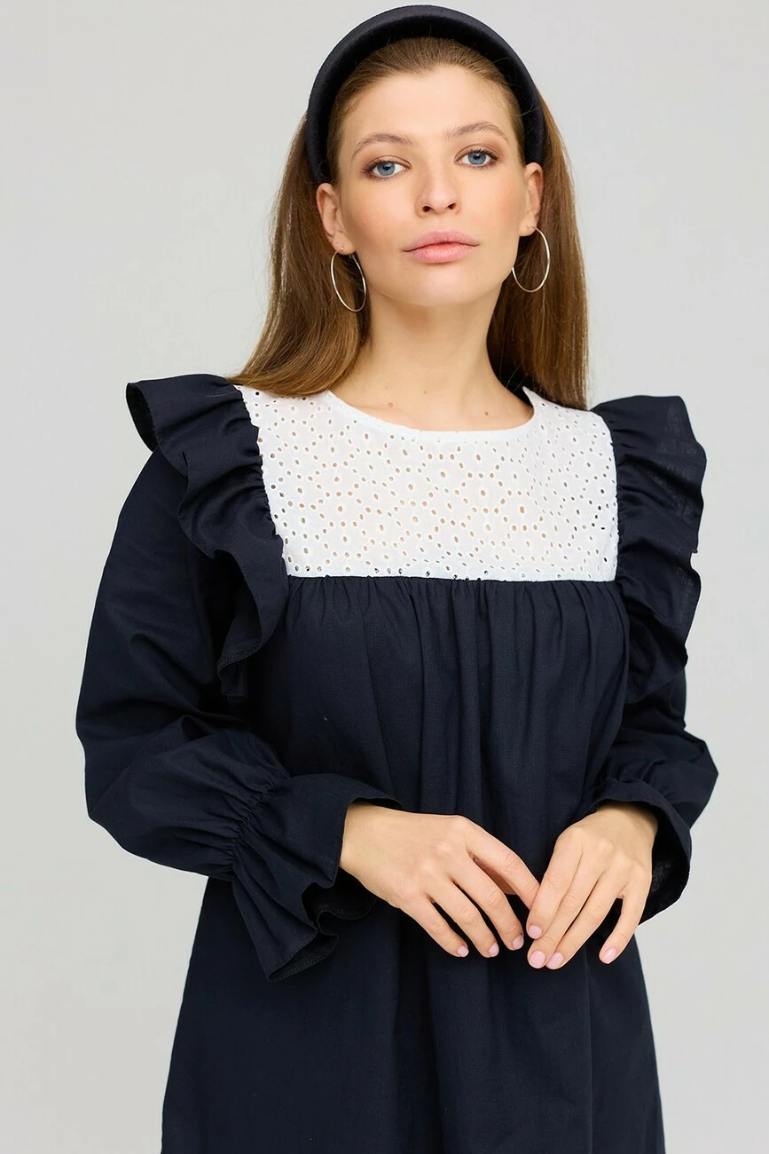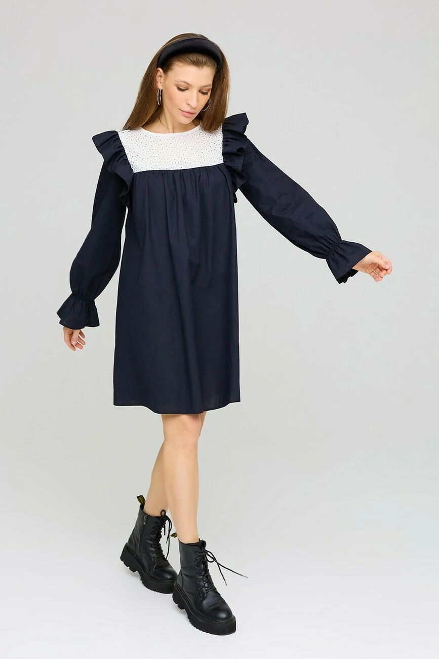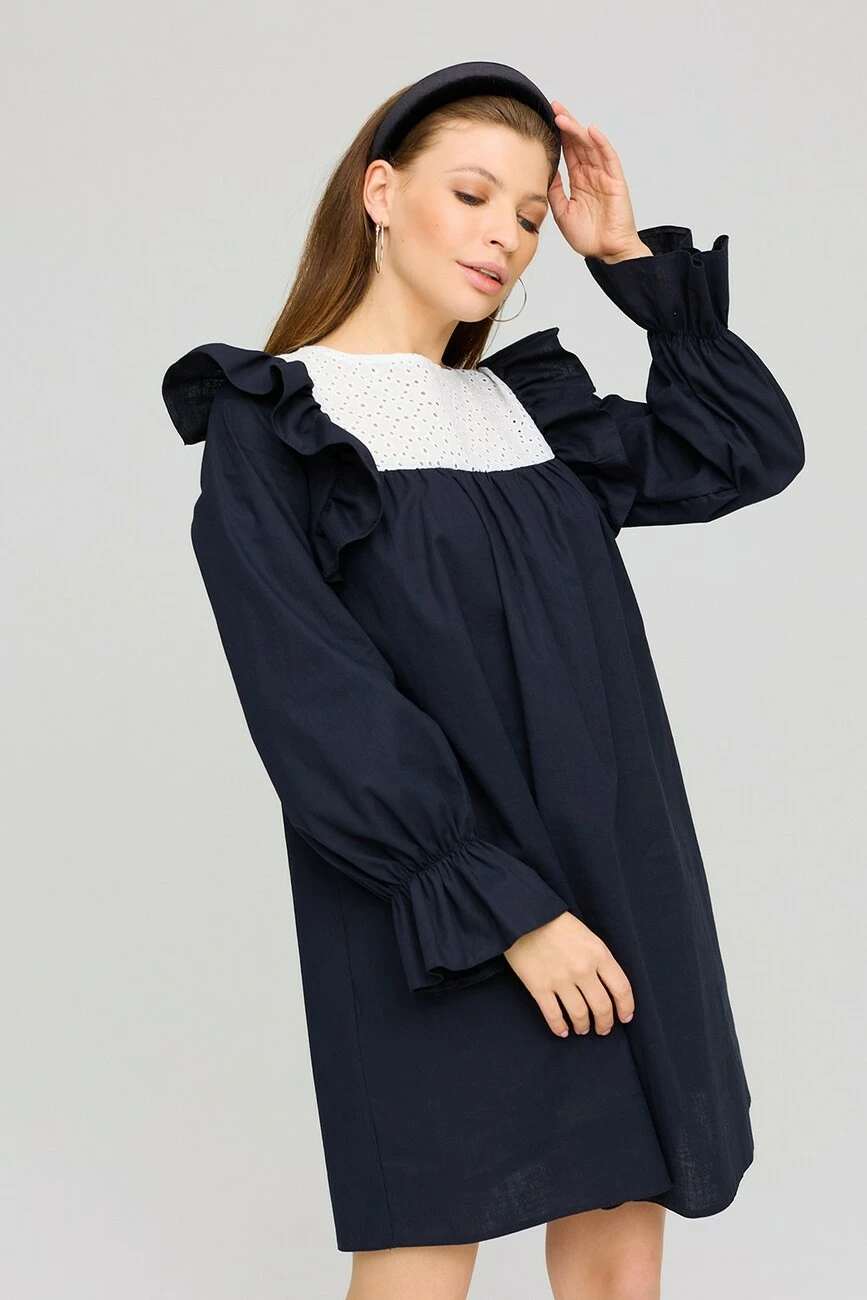 Платье А-силуэта из фактурного льна. Длина мини, длинный рукав собранный на резинку, по груди кокетка из прошвы. По плечу декор в виде небольшого валана