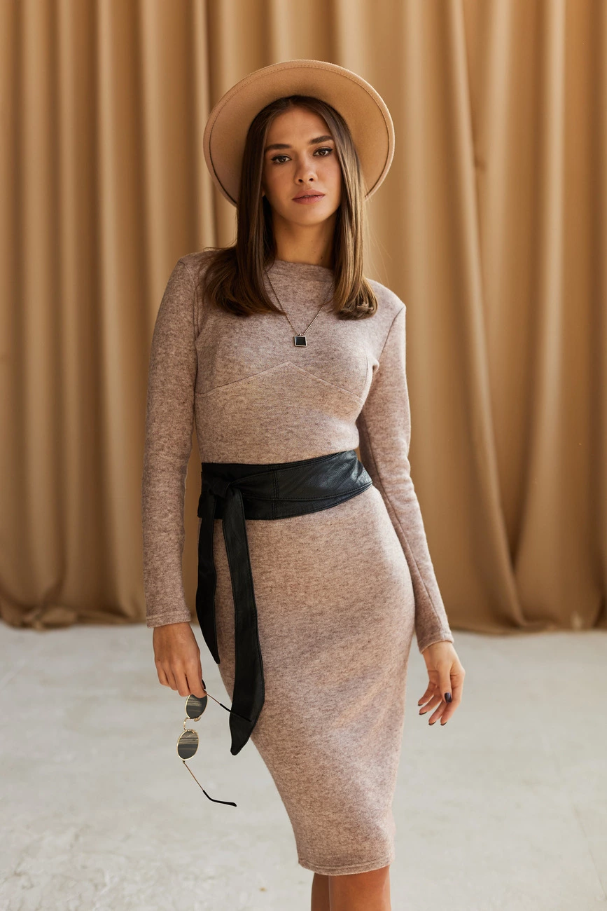 Платье миди длины из теплого тянущегося трикотажа, невысокий воротник, длинный рукав, под грудью фигурная отстрочка