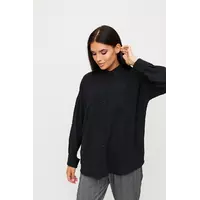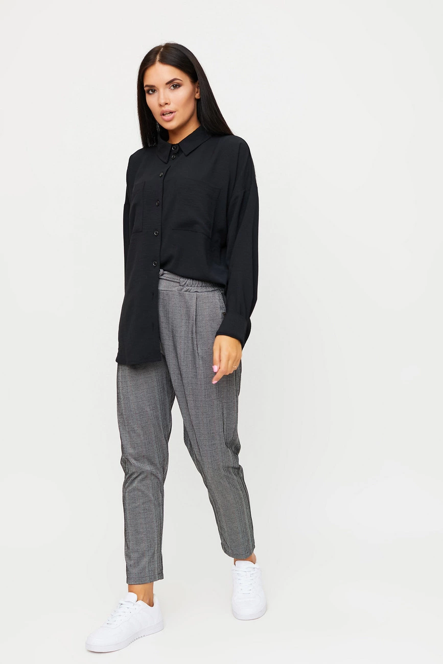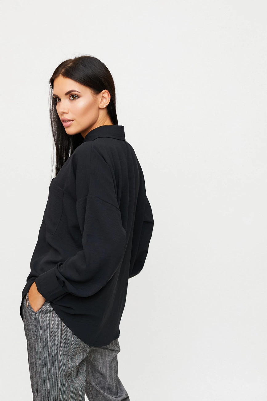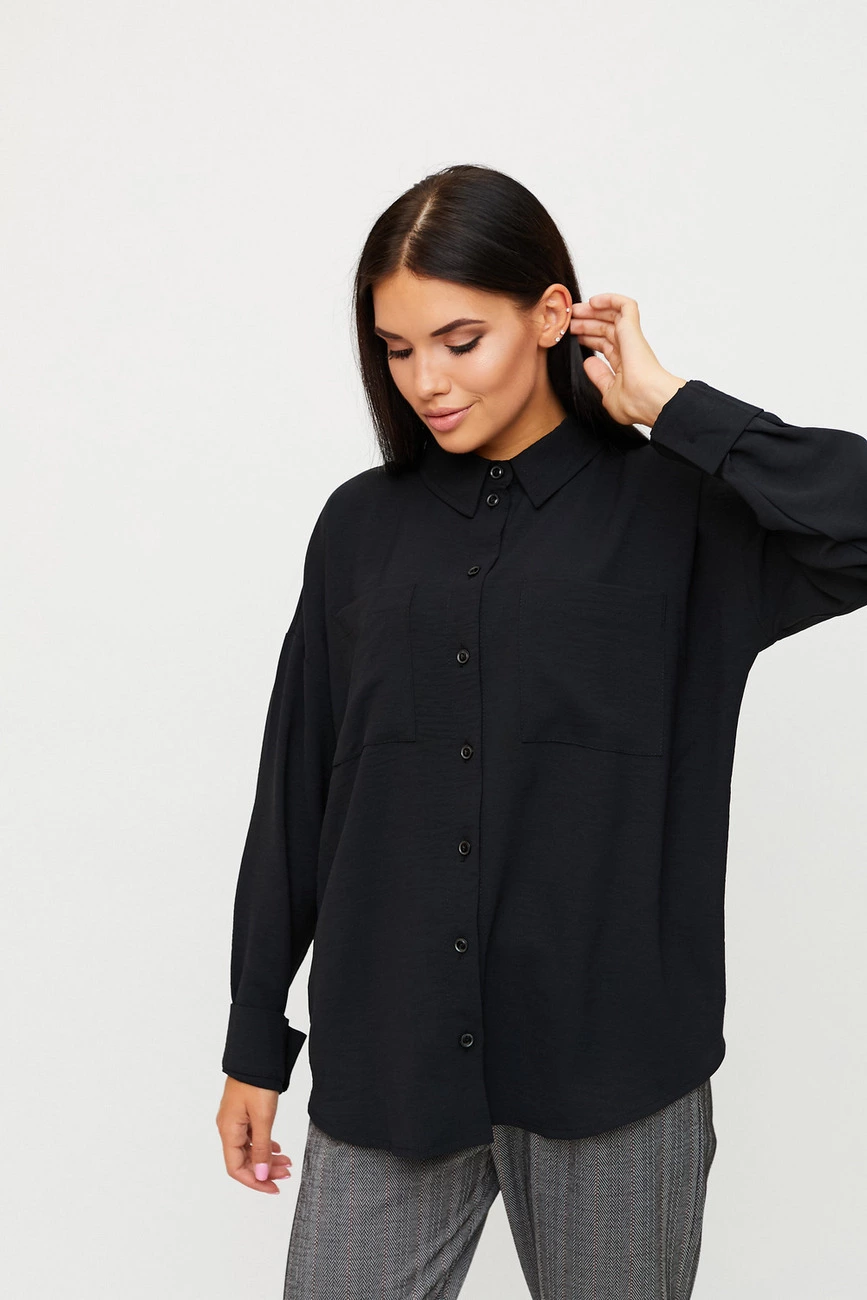 Рубашка свободного кроя из легкой блузочной ткани, спущенная линия плеча, воротник-стойка, длинный рукав с манжетами, накладные карманы на груди