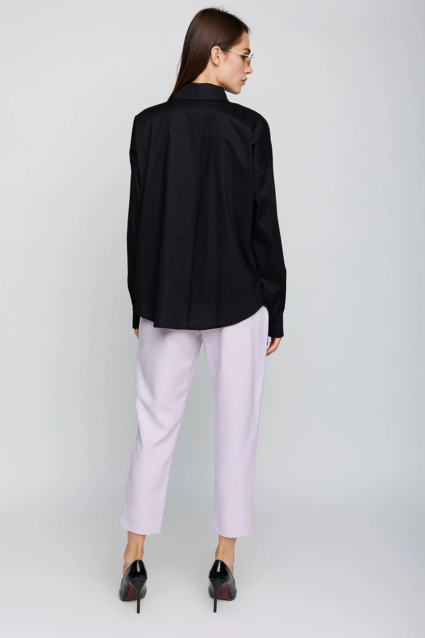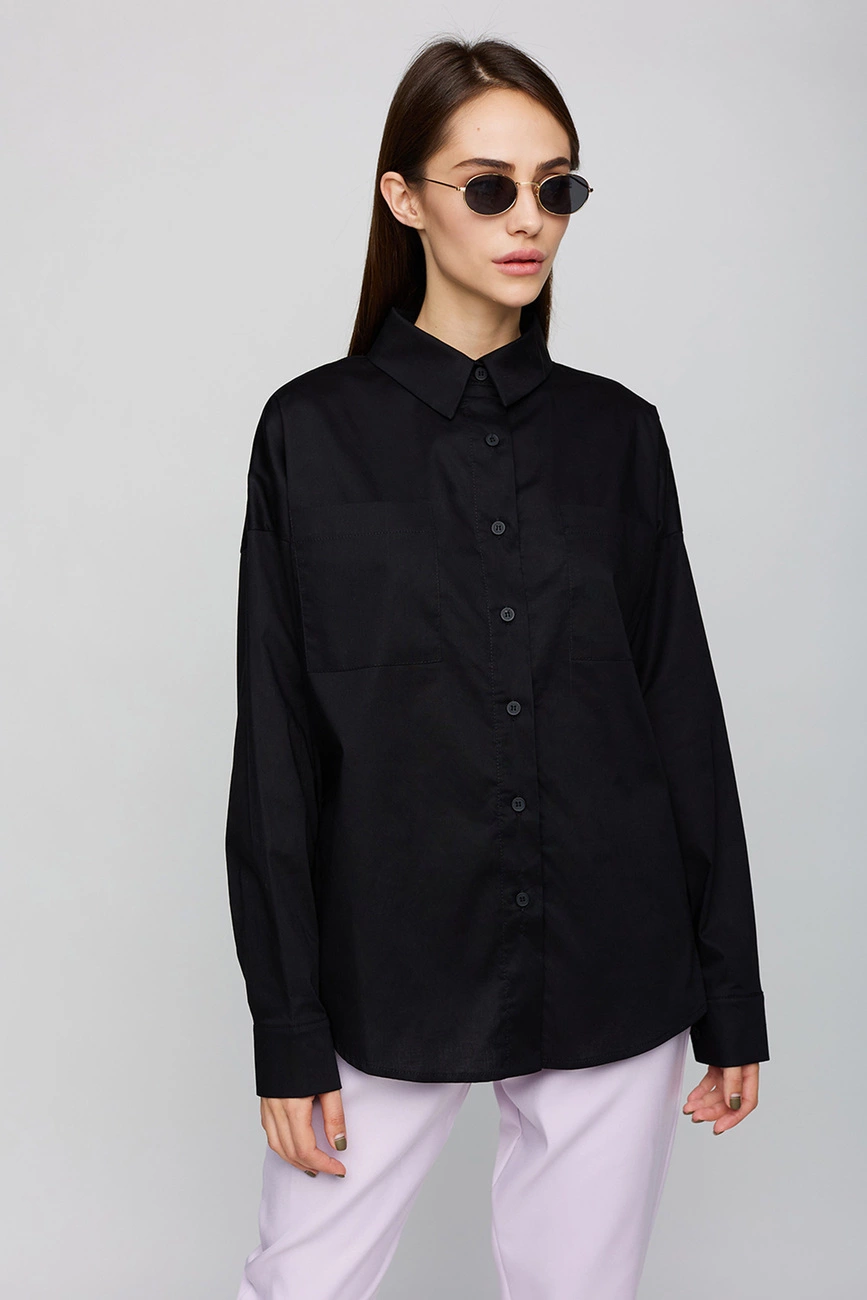 Рубашка свободного кроя из коттона, спущенная линия плеча, воротник-стойка, длинный рукав с манжетами, накладные карманы на груди