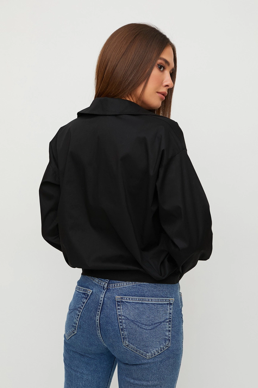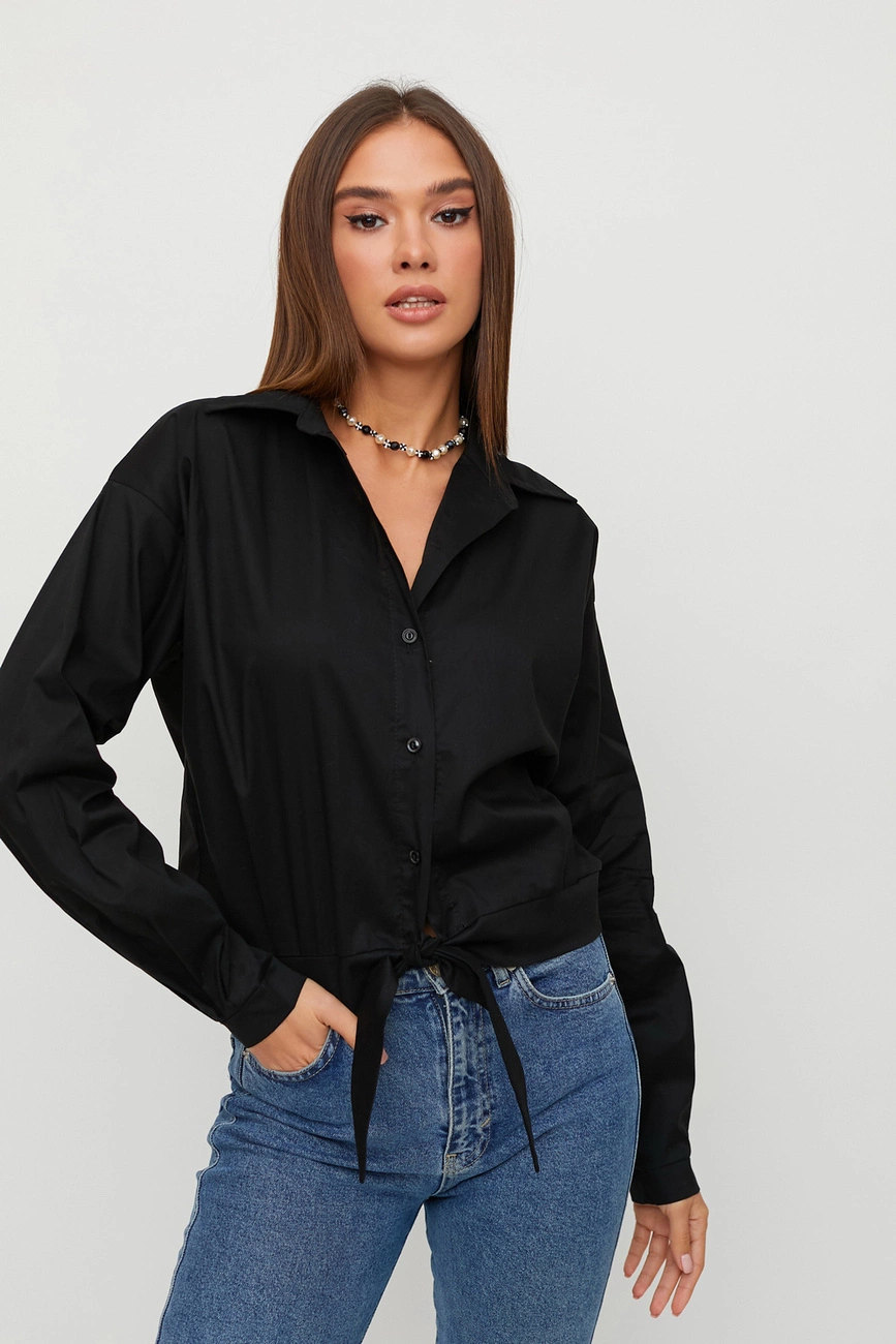 Рубашка из хлопковой ткани укороченного покроя, спущенная линия плеча, широкий рукав с манжетом, воротник-стойка, по низу рубашки манжет с завязкой
