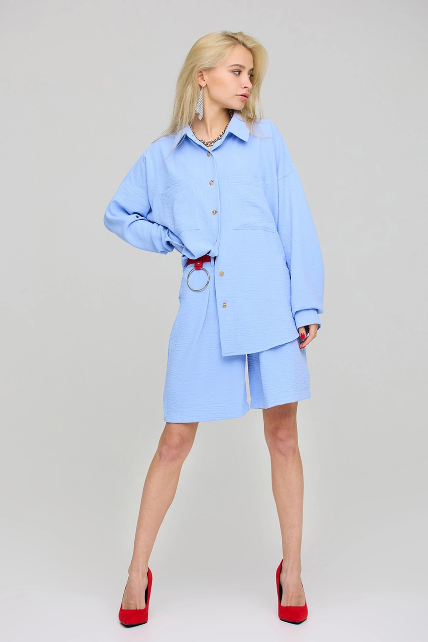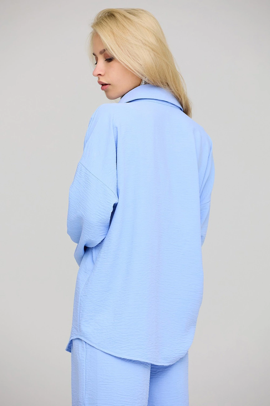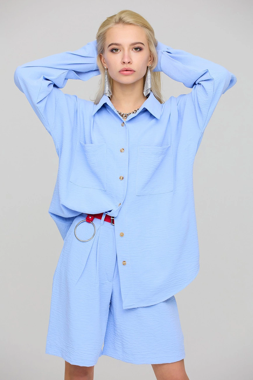 Рубашка свободного кроя из легкой блузочной ткани, спущенная линия плеча, воротник-стойка, длинный рукав с манжетами, накладные карманы на груди
