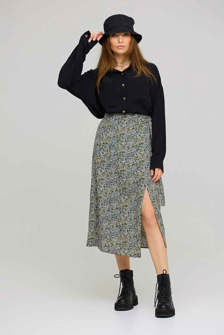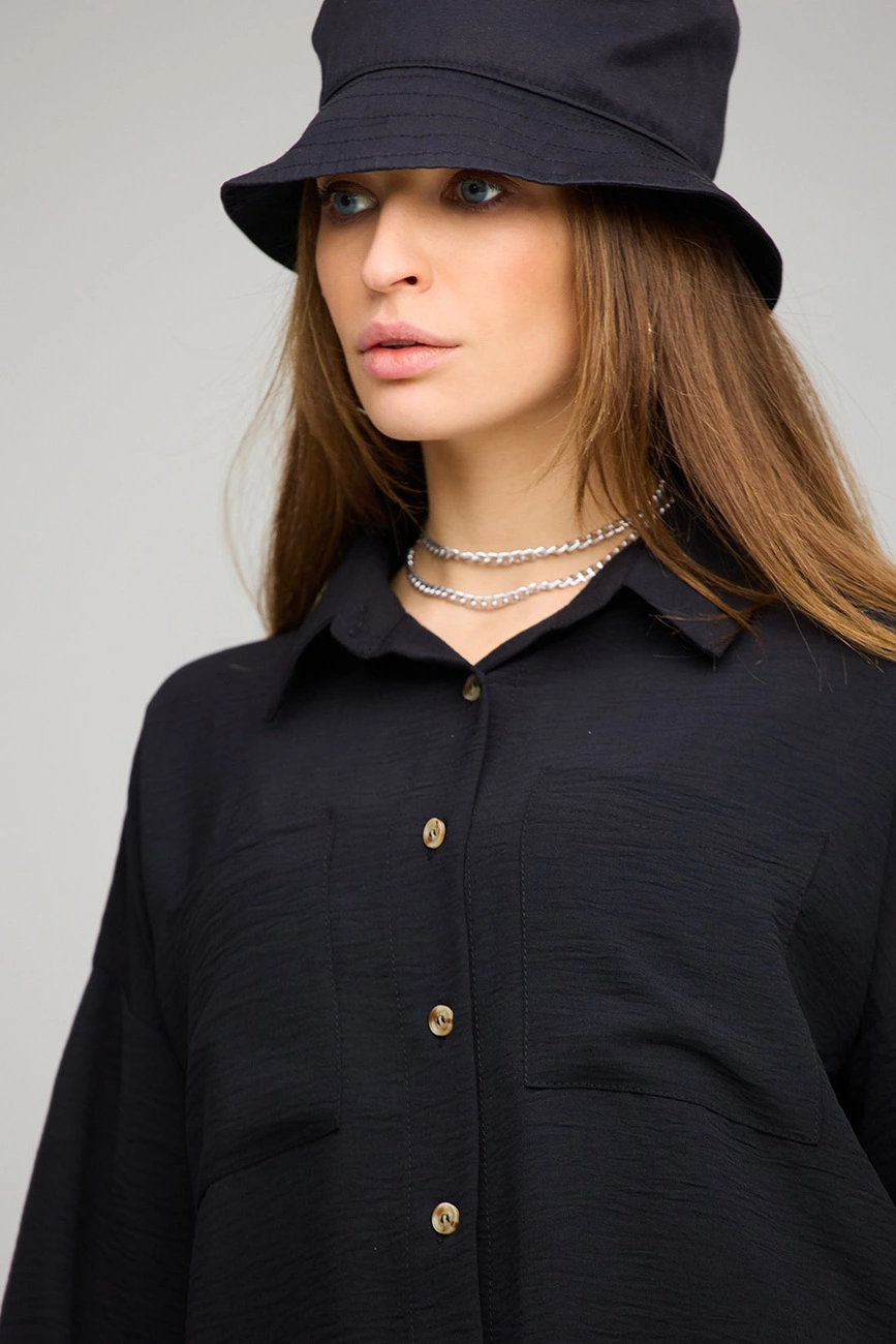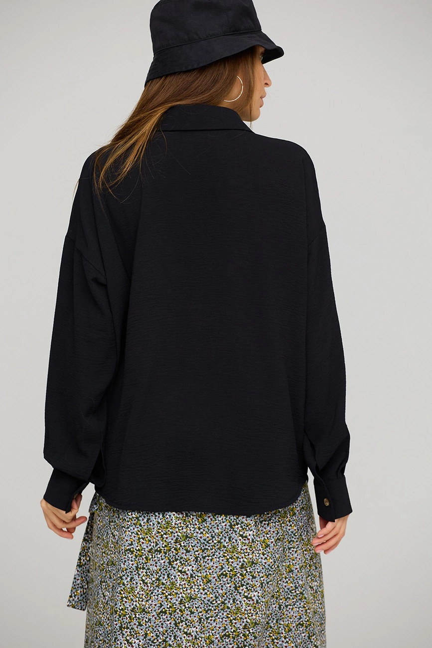 Рубашка свободного кроя из легкой блузочной ткани, спущенная линия плеча, воротник-стойка, длинный рукав с манжетами, накладные карманы на груди