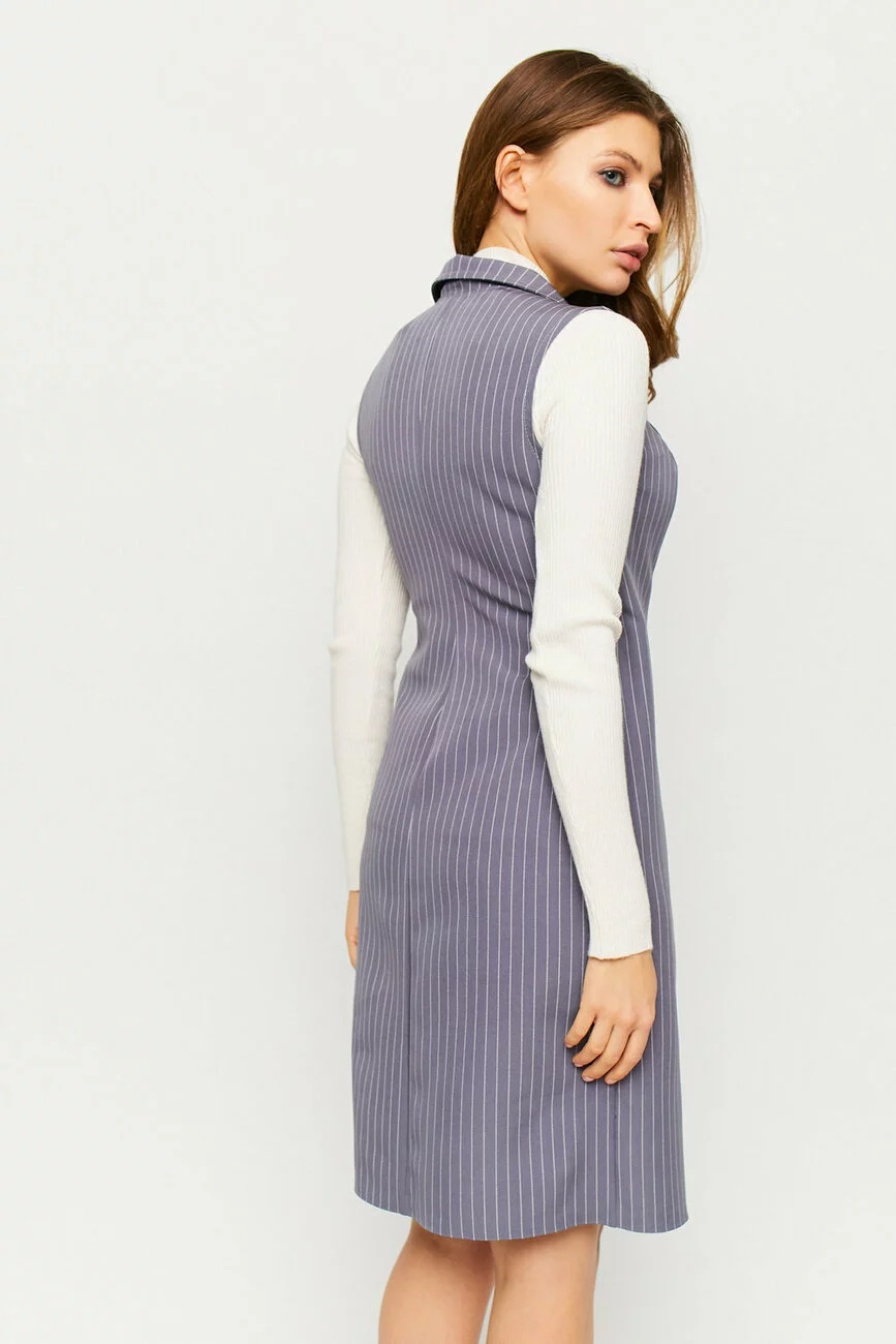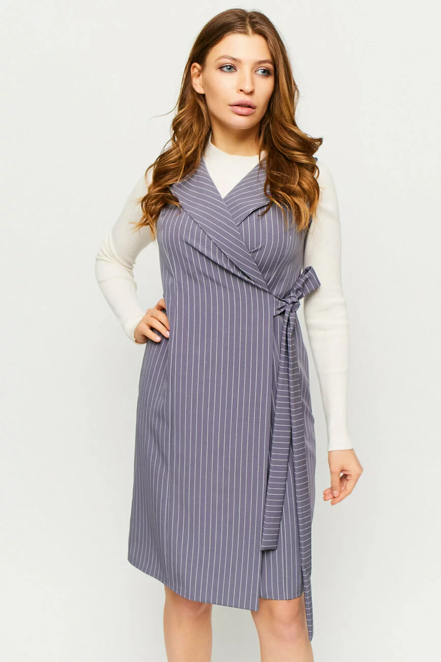 Платье-сарафан с бортами без рукавов из слаботянущейся ткани в полоску, приталенный крой, модель с запахом, фиксируется вшитым поясом-завязками