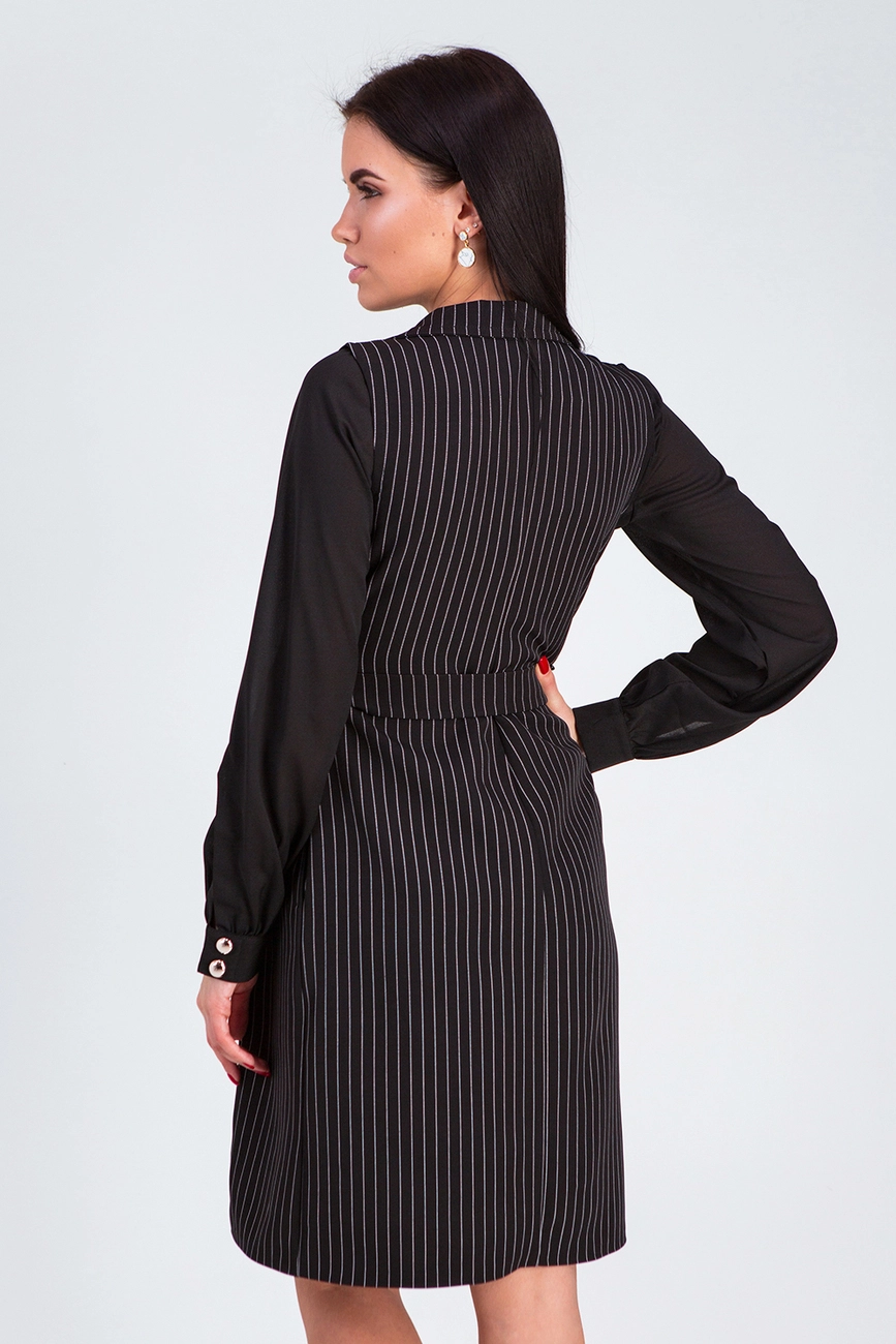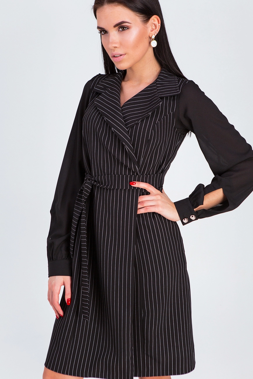 Платье-сарафан с бортами без рукавов из слаботянущейся ткани в полоску, приталенный крой, модель с запахом, фиксируется вшитым поясом-завязками