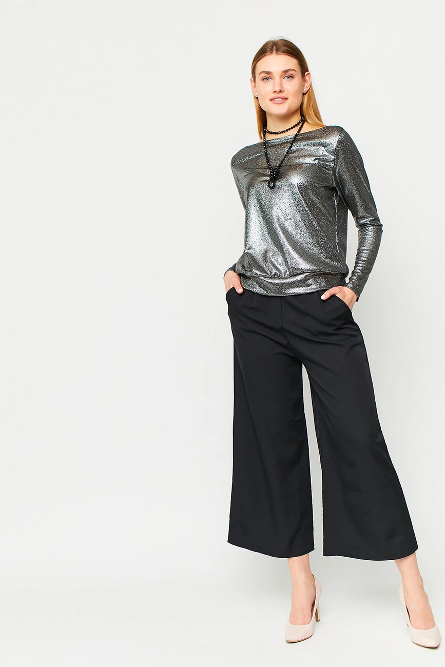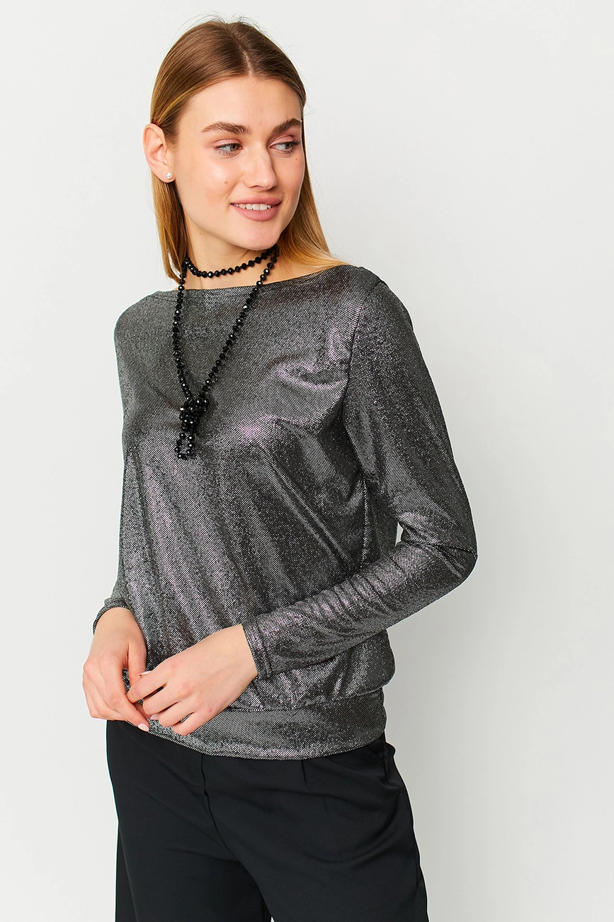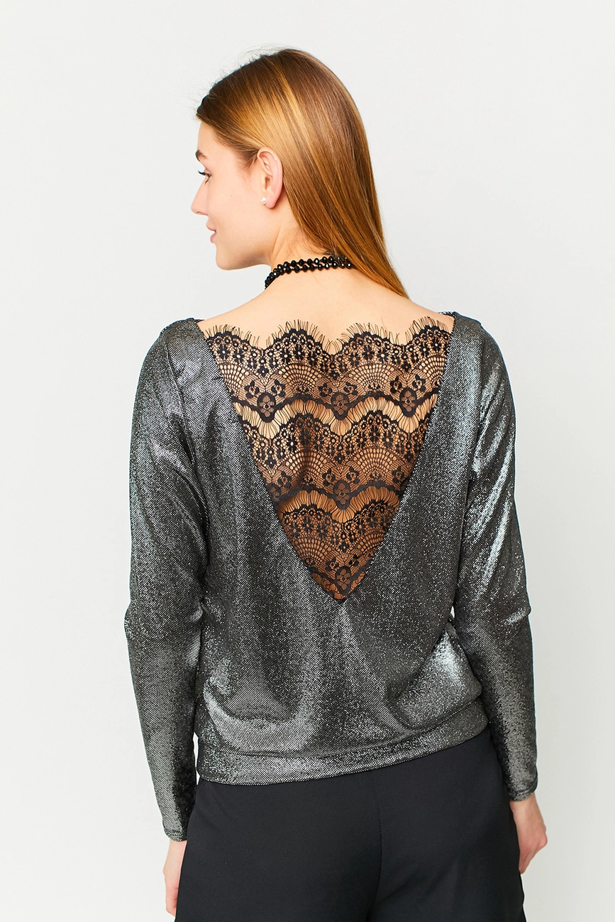 Кофта из тянущегося трикотажа с блеском, глубокий вырез на спине из тонкого гипюра, по низу изделия манжет