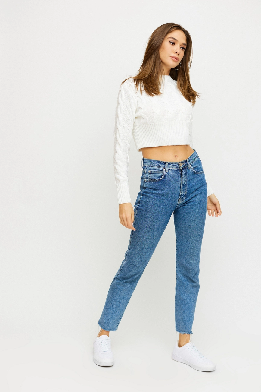 Свитер укороченного кроя из теплого вязанного трикотажа с добавлением шерсти, широкий воротник, длинный рукав, широкие манжеты на рукавах и по низу изделия