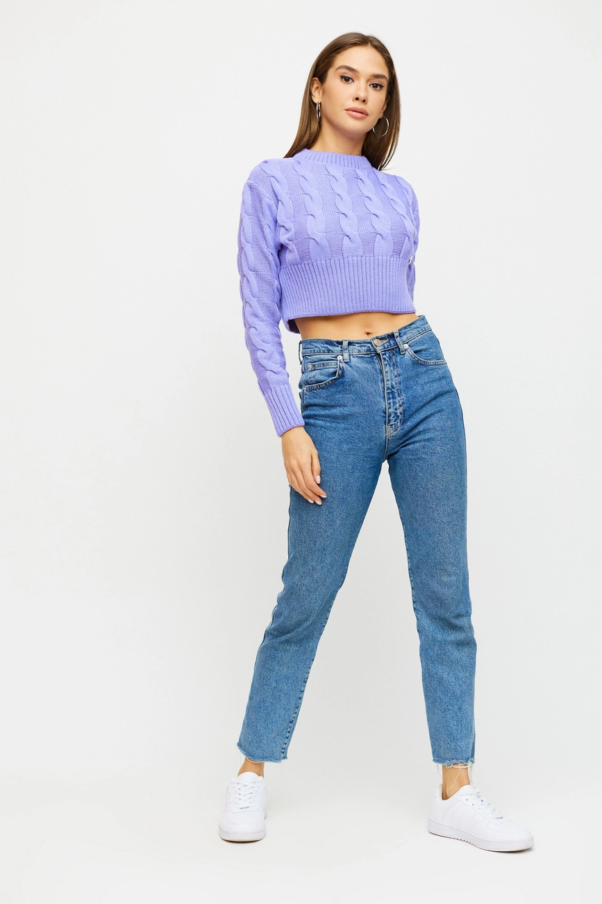 Свитер укороченного кроя из теплого вязанного трикотажа с добавлением шерсти, широкий воротник, длинный рукав, широкие манжеты на рукавах и по низу изделия