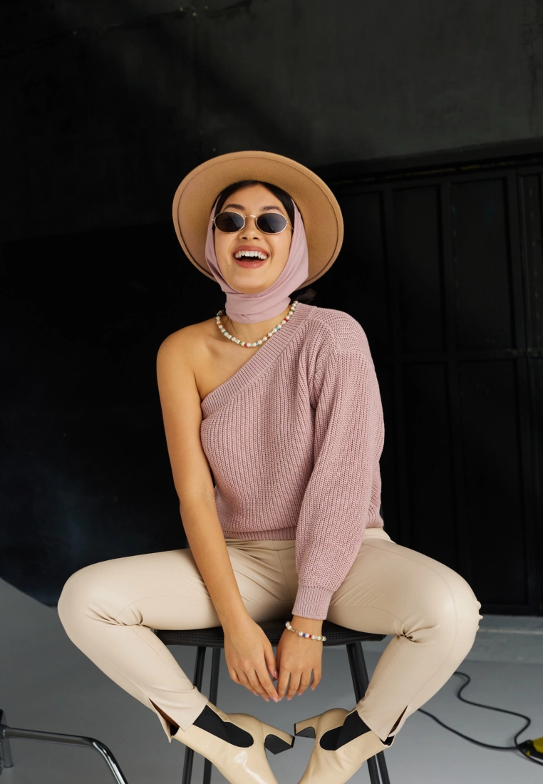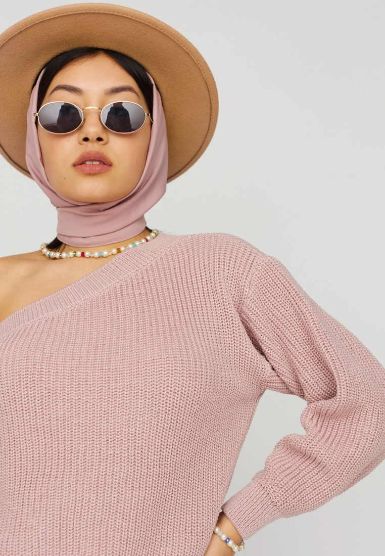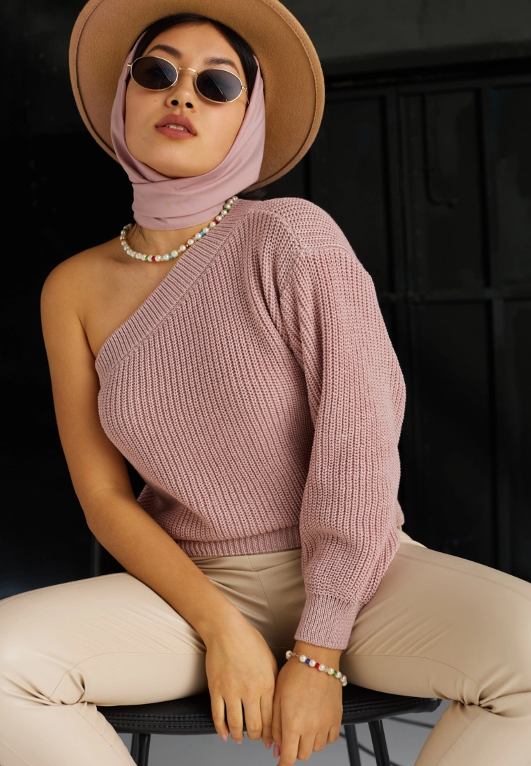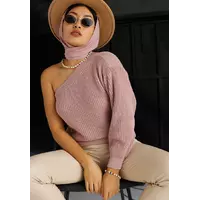 Ассиметричный свитер из хлопка, открытое плече, широкий рукав. По краям манжеты.