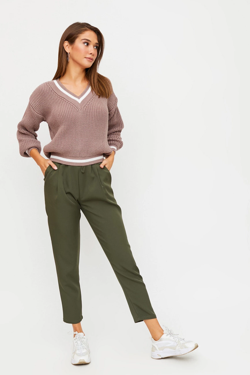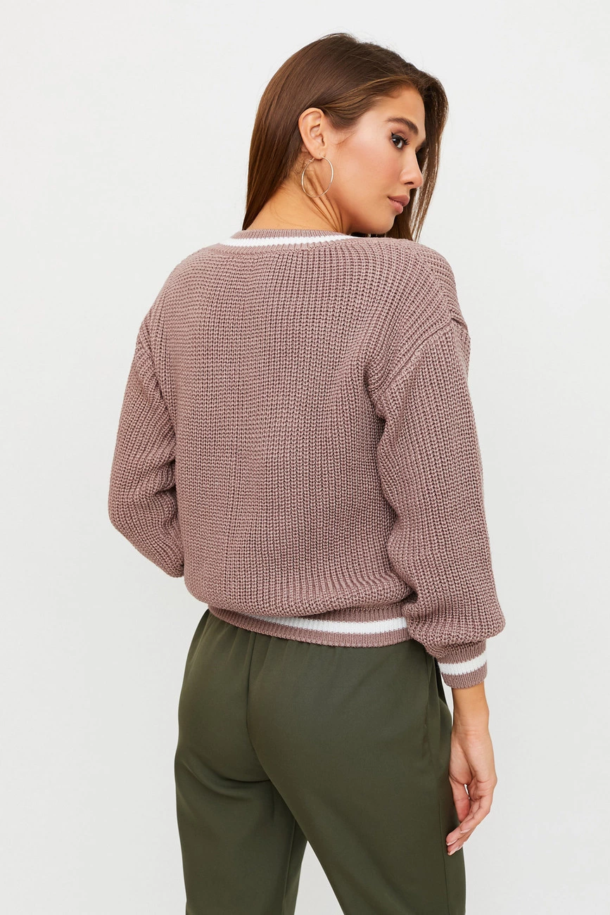 Свитер oversize из теплого вязанного трикотажа с добавлением шерсти, V-образный вырез, спущенная линия плеча, манжеты на рукавах и по низу изделия