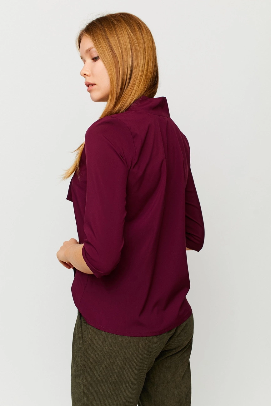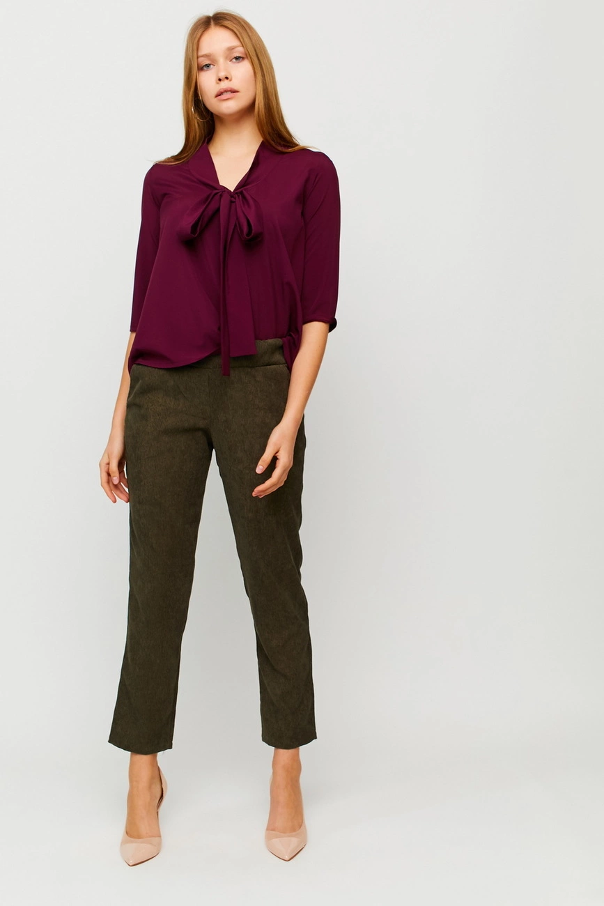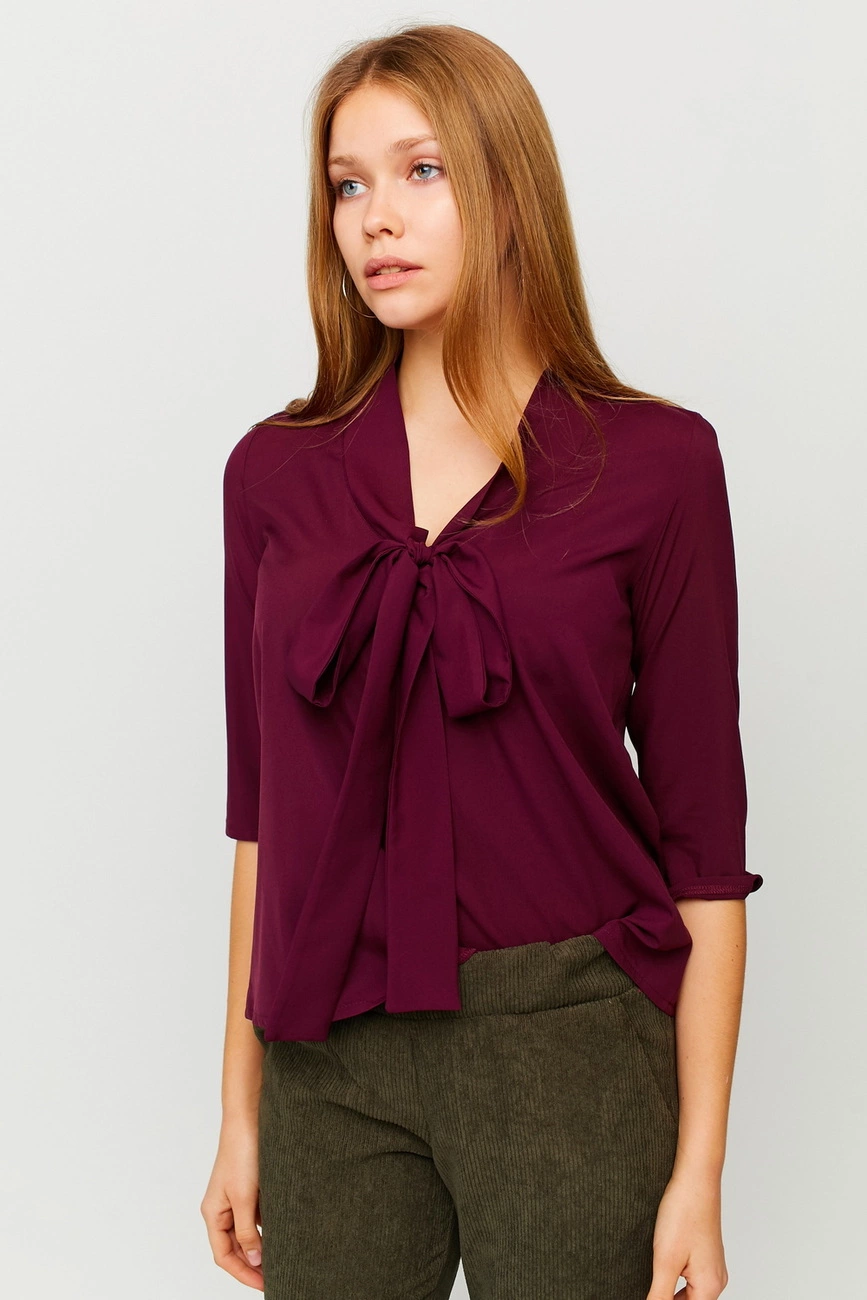 Материал: софт Размер: S, M, L Растяжимость ткани: слабая Длина изделия (размер S): 58 см Длина рукава (размер S): 41 см Полуобхват плечи/грудь/талия (размер S): 36/50/56 см Рекомендации по уходу: ручная стирка в прохладной воде Блуза свободного кроя из легкой ткани, рукав 3/4, декольте - V-образный вырез, декорированный завязкой-бантом