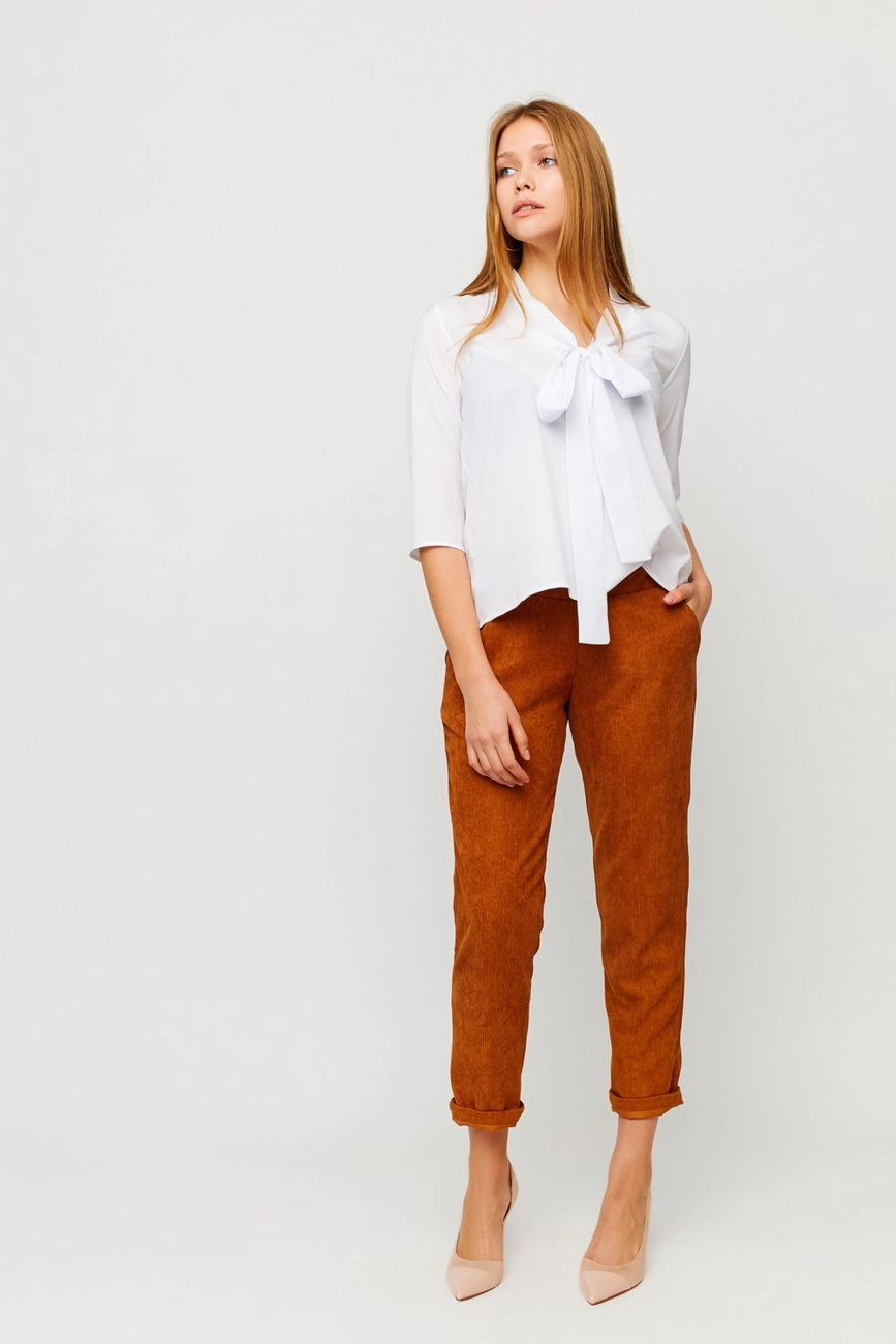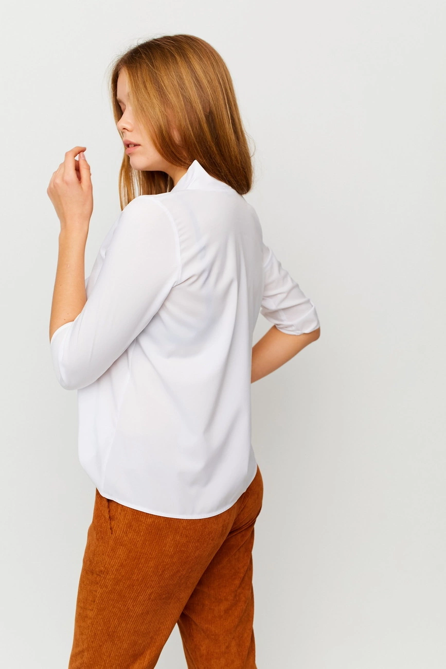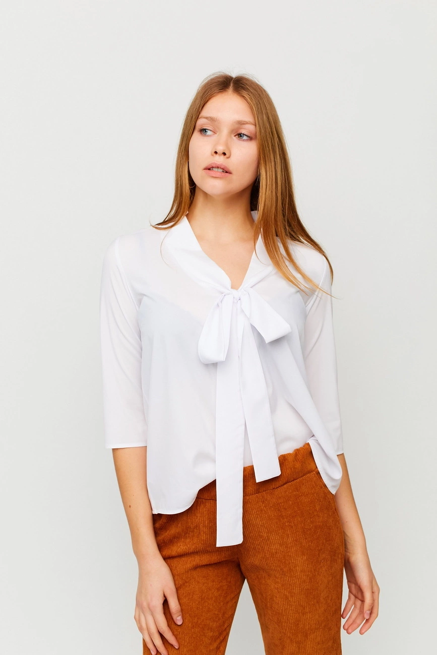 Материал: софт Размер: S, M, L Растяжимость ткани: слабая Длина изделия (размер S): 58 см Длина рукава (размер S): 41 см Полуобхват плечи/грудь/талия (размер S): 36/50/56 см Рекомендации по уходу: ручная стирка в прохладной воде Блуза свободного кроя из легкой ткани, рукав 3/4, декольте - V-образный вырез, декорированный завязкой-бантом