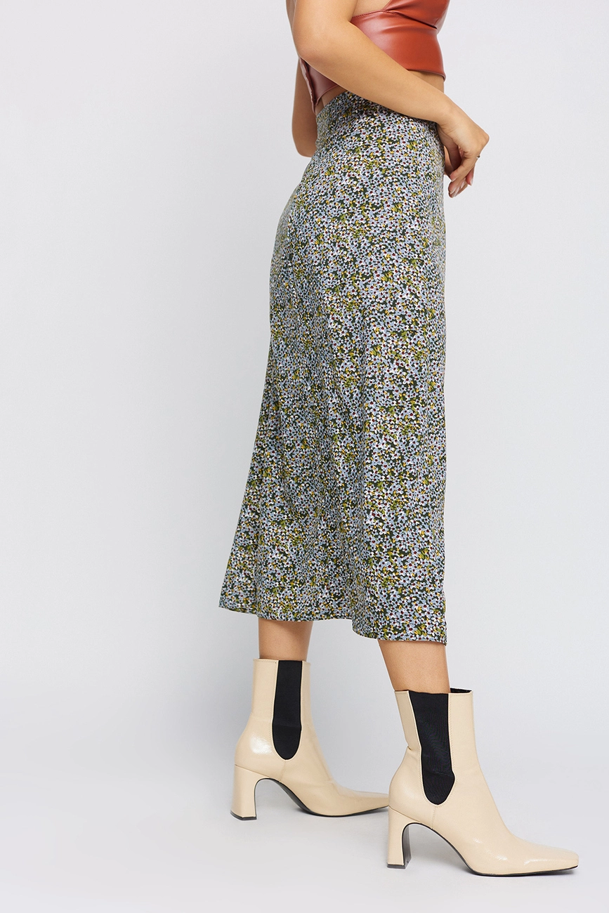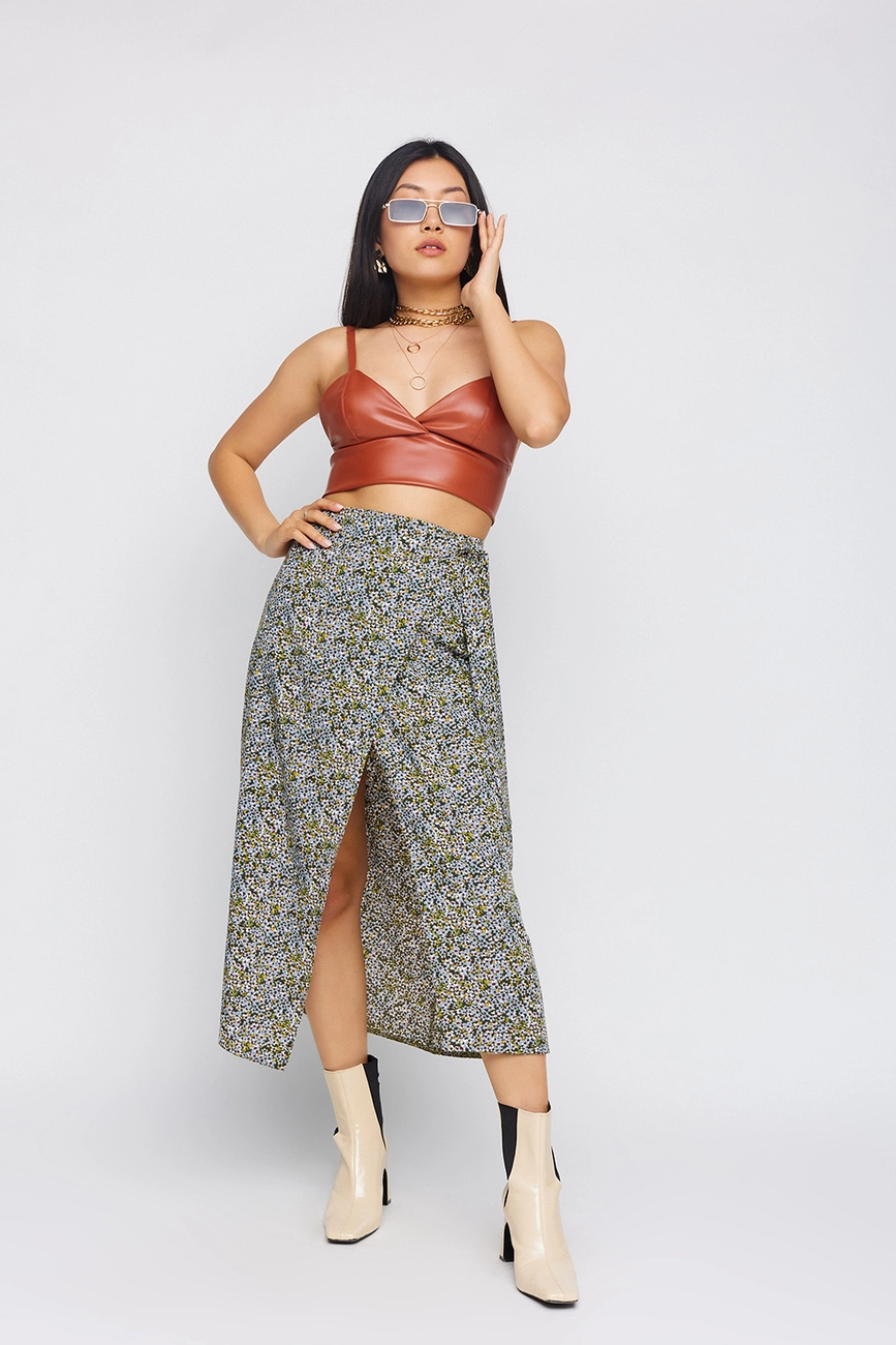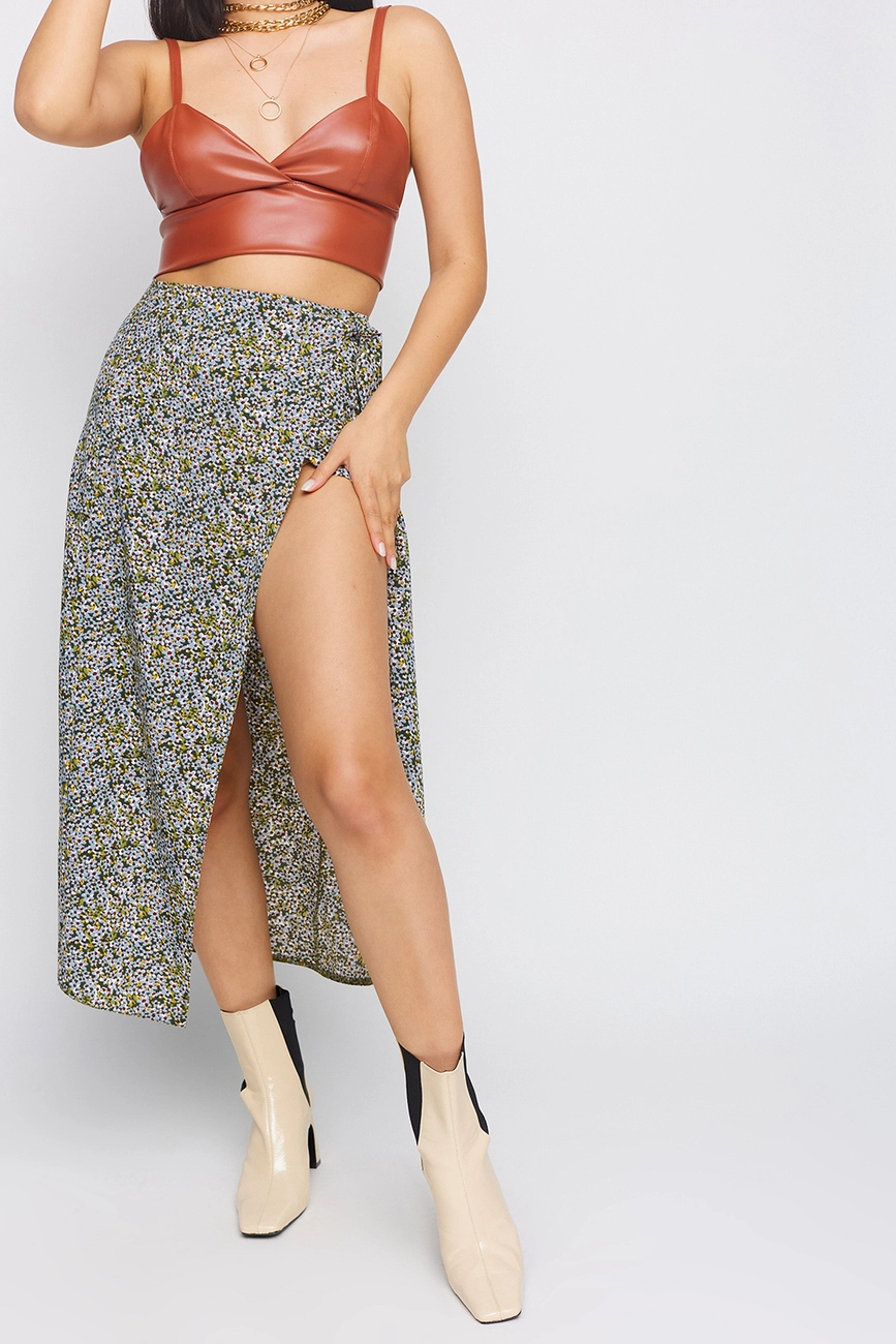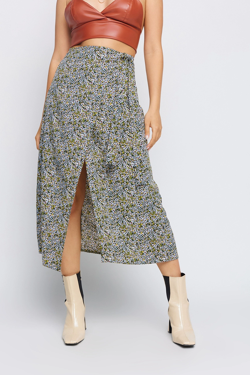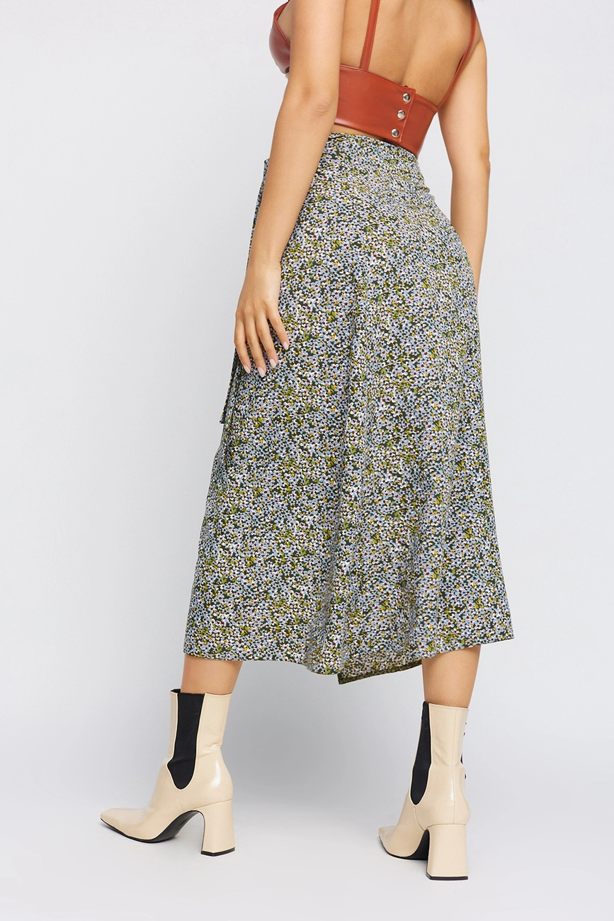 Юбка миди с запахом трапециевидного кроя из софта, посадка на талии; застежка: завязки, потайная пуговица.