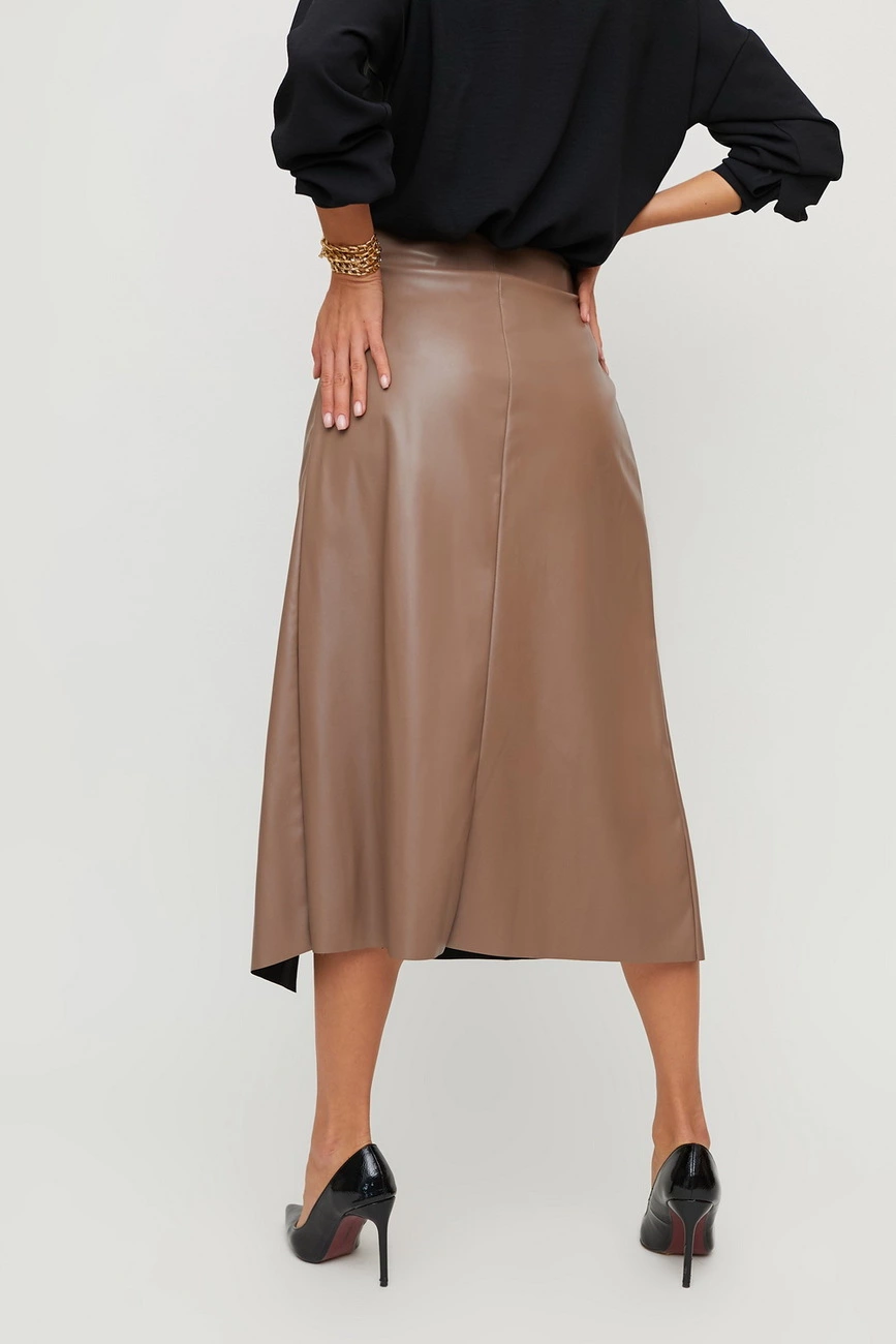 Юбка миди с запахом трапециевидного кроя из эко-кожи, посадка на талии; застежка: завязки, потайная пуговица.