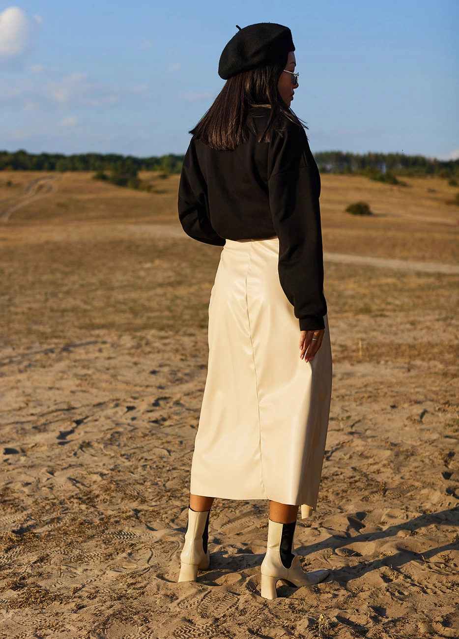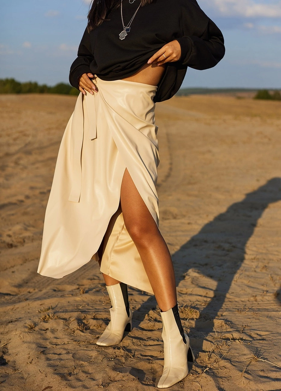 Юбка миди с запахом трапециевидного кроя из эко-кожи, посадка на талии; застежка: завязки, потайная пуговица.