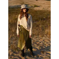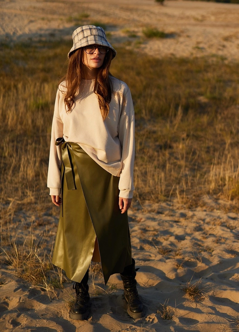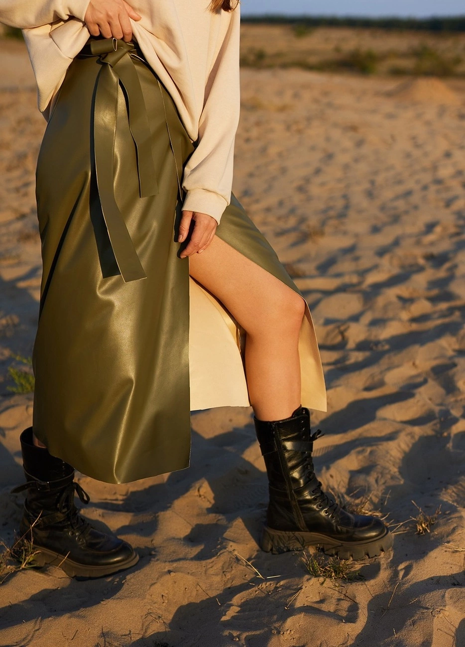 Юбка миди с запахом трапециевидного кроя из эко-кожи, посадка на талии; застежка: завязки, потайная пуговица.